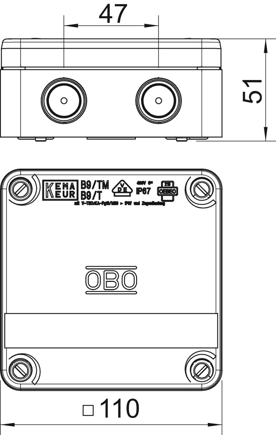 Description du produitB9/T.... : comporte deux composants différents en plastique, sans halogène, 8 entrées filetées (PG16) avec membrane défonçable (pour les diamètres de câble jusqu’à 15 mm) au niveau du sol. En cas d’utilisation des presse-étoupes (décharge de traction supplémentaire), il n’est pas nécessaire de retirer la membrane (gain de temps). Indice de protection IP 67 avec membrane défonçable et avec presse-étoupe sans retrait de la membrane défonçable.