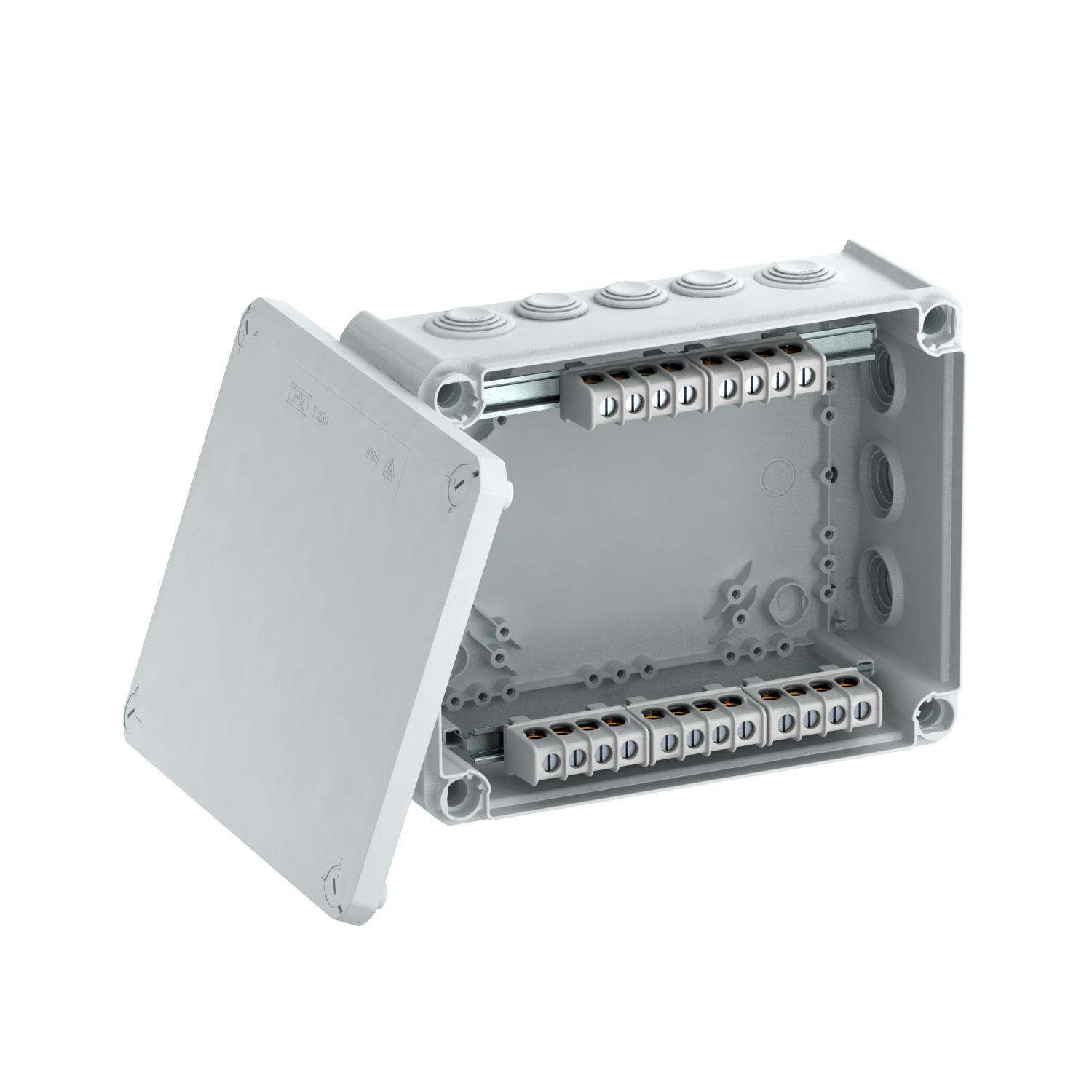 Description du produitBoîtier de dérivation avec bornier pour le raccordement des câbles et conduites en intérieur et en extérieur protégé Forme rectangulaire avec des joints d’étanchéité sur les côtés et des entrées défonçables dans le fond. Convient pour le montage au mur/ au plafond, sur tôle de montage et des filetages dans le sol. Avec possibilité de fixation intérieure et de montage à travers le dôme angulaire. Couvercle avec fermeture rapide, plombable. Fabriqué à partir de matériaux sans halogène et résistants aux UV. Boite de dérivation selon la norme DIN EN 60670. Ignifugé selon DIN EN 60695-2-11, Température d'essai 650 °C. Résistance aux chocs IK05 selon la norme DIN EN 50102.