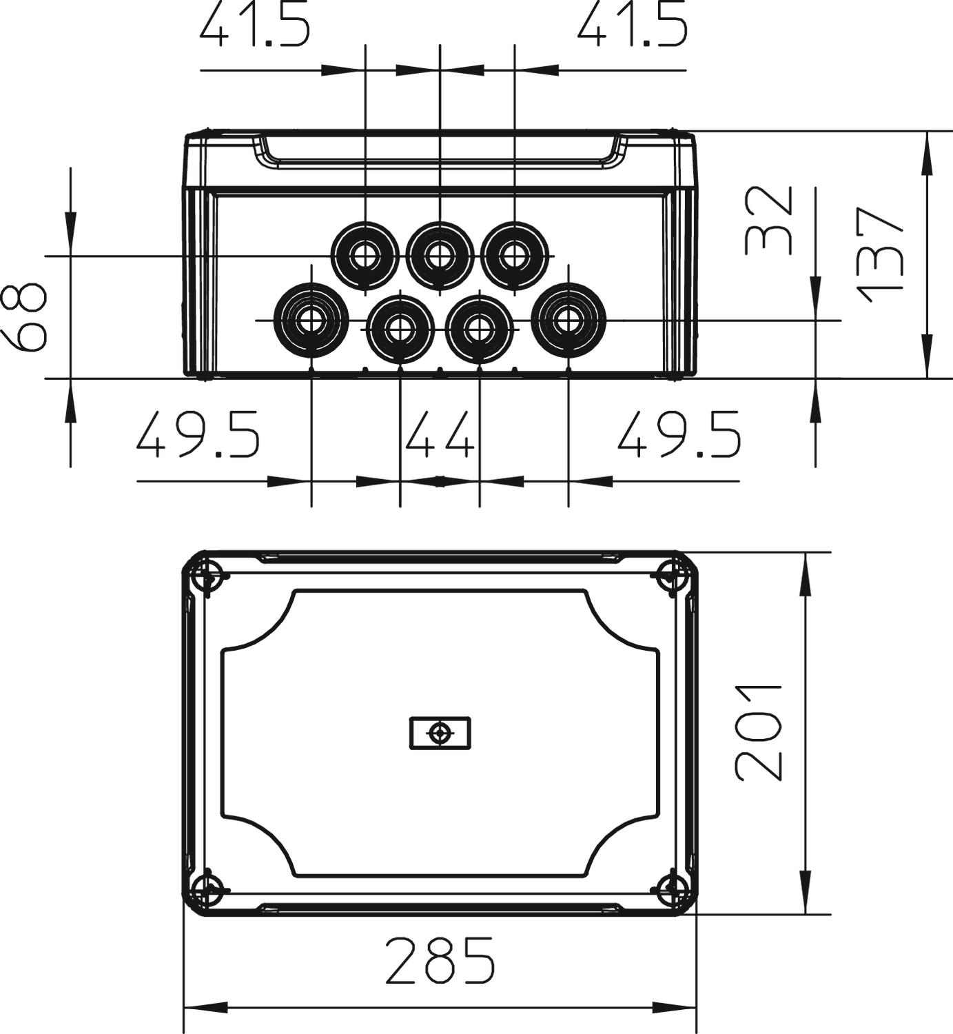 Description du produitBoite de dérivation pour le raccordement des câbles et conduits en intérieur et en extérieurs protégés. Forme rectangulaire avec embouts à tétine. Convient pour le montage au mur/ au plafond, sur tôle de montage et des filetages dans le sol. Avec possibilité de fixation intérieure et de montage à travers le dôme angulaire. Couvercle haut avec fermeture rapide, plombable. Fabriqué à partir de matériaux sans halogène et résistants aux UV. rail DIN symétrique inclus.Boite de dérivation selon la norme DIN EN 60670. Ignifugé selon DIN EN 60695-2-11, Température d'essai 650 °C. Résistance aux chocs IK05 selon la norme DIN EN 50102.