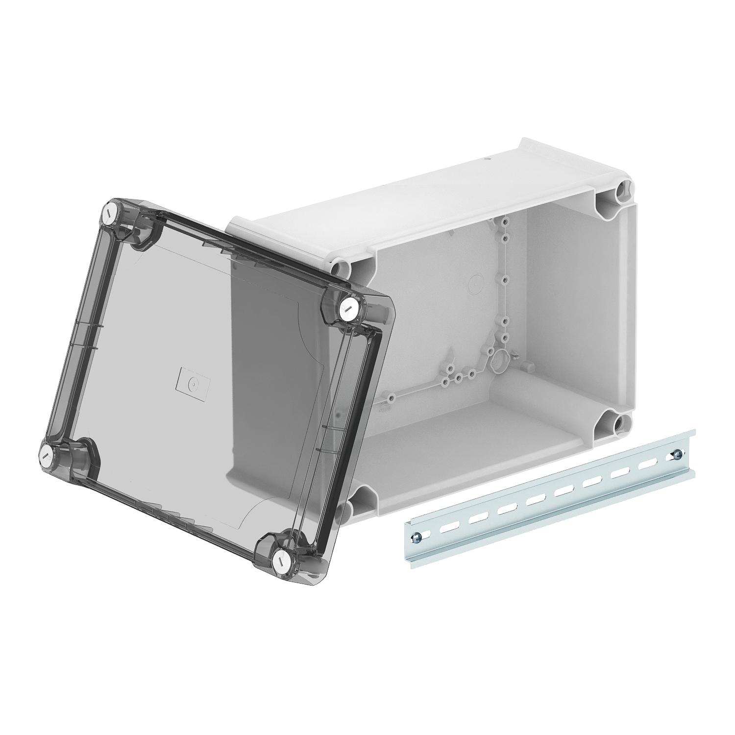 Description du produitBoite de dérivation fermé pour le raccordement des câbles et conduits en intérieur et en extérieurs protégés. Forme rectangulaire sans ouvertures. Convient pour le montage au mur/ au plafond, sur tôle de montage et des filetages dans le sol. Avec possibilité de fixation intérieure et de montage à travers le dôme angulaire. Couvercle haut et transparent avec fermeture rapide, plombable. Fabriqué à partir de matériaux sans halogène.