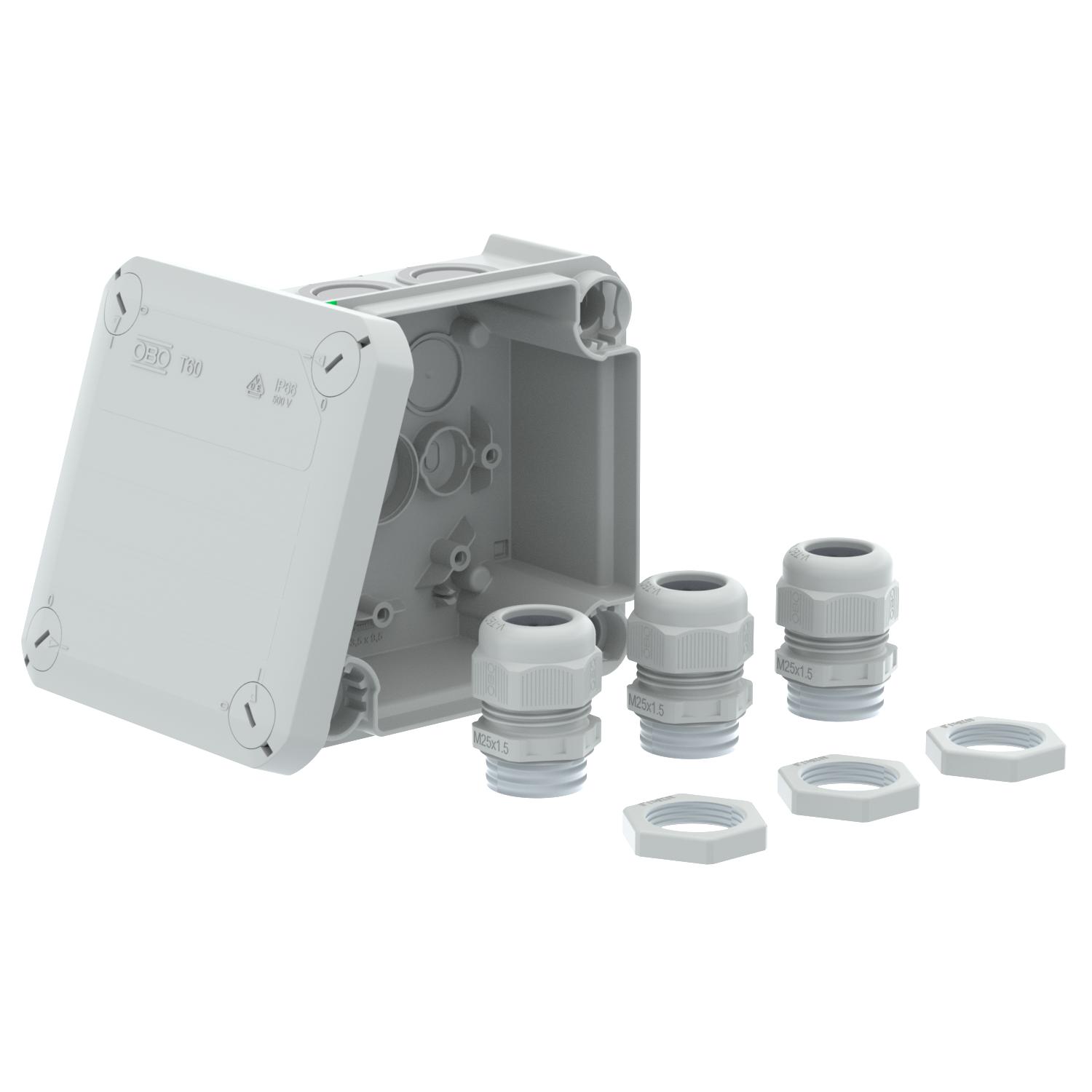 Description du produitBoite de dérivation pour le raccordement des câbles et conduits en intérieur et en extérieurs protégés. Forme carrée avec prédécoupes défonçables sur les côtés et dans le fond. Convient pour le montage au mur / au plafond et sur des tôles de montage. Avec possibilité de fixation intérieure et de montage à travers le dôme angulaire. Couvercle avec fermeture rapide, plombable. Fabriqué à partir de matériaux sans halogène et résistants aux UV. 3 presse-étoupes V-TEC M20 avec contre-écrous inclus.Boite de dérivation selon la norme DIN EN 60670. Ignifugé selon DIN EN 60695-2-11, Température d'essai 650 °C. Résistance aux chocs IK07 selon la norme DIN EN 50102.
