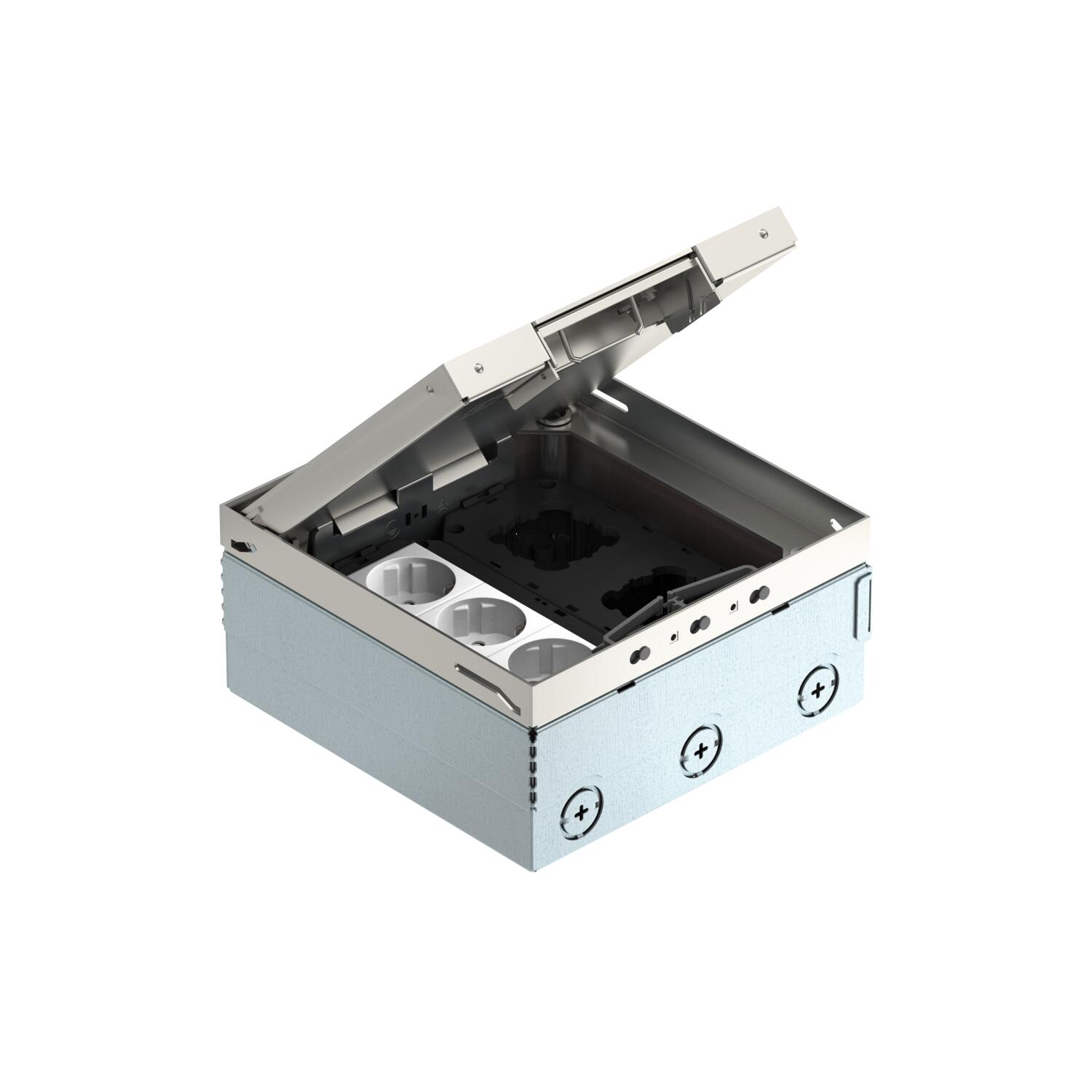 Description du produitBoîte de sol carrée pour une utilisation dans des planchers creux et des chapes nettoyés à sec, utilisation à l'intérieur. Boîtier d’encastrement avec pré-poinçonnage des ouvertures pour tuyaux (M25). Avec 2 supports universels UT3 et une prise triple. Couvercle réglable à l’aide de 4 supports de nivellement sur le rebord supérieur du revêtement de sol. La profondeur d'encastrement minimale est de 95 mm, la plage de réglage + 30 mm.