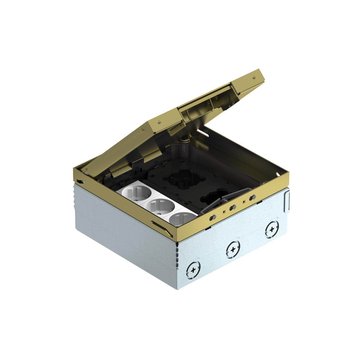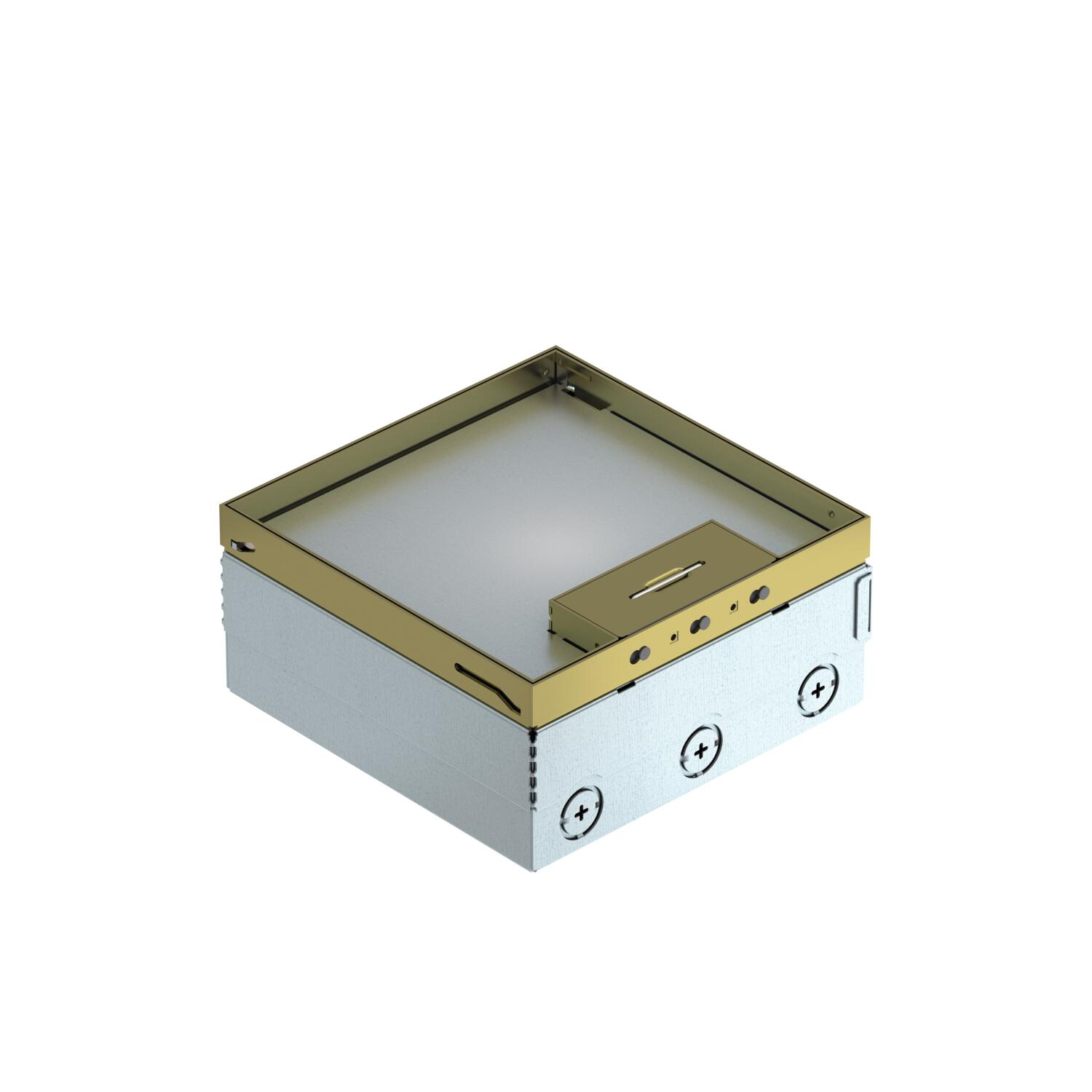 Description du produitBoîte de sol carrée pour une utilisation dans des planchers creux et des chapes nettoyés à sec, utilisation à l'intérieur. Boîtier d’encastrement avec pré-poinçonnage des ouvertures pour tuyaux (M25). Avec 2 supports universels UT3 et une prise triple. Couvercle réglable à l’aide de 4 supports de nivellement sur le rebord supérieur du revêtement de sol. La profondeur d'encastrement minimale est de 95 mm, la plage de réglage + 30 mm.