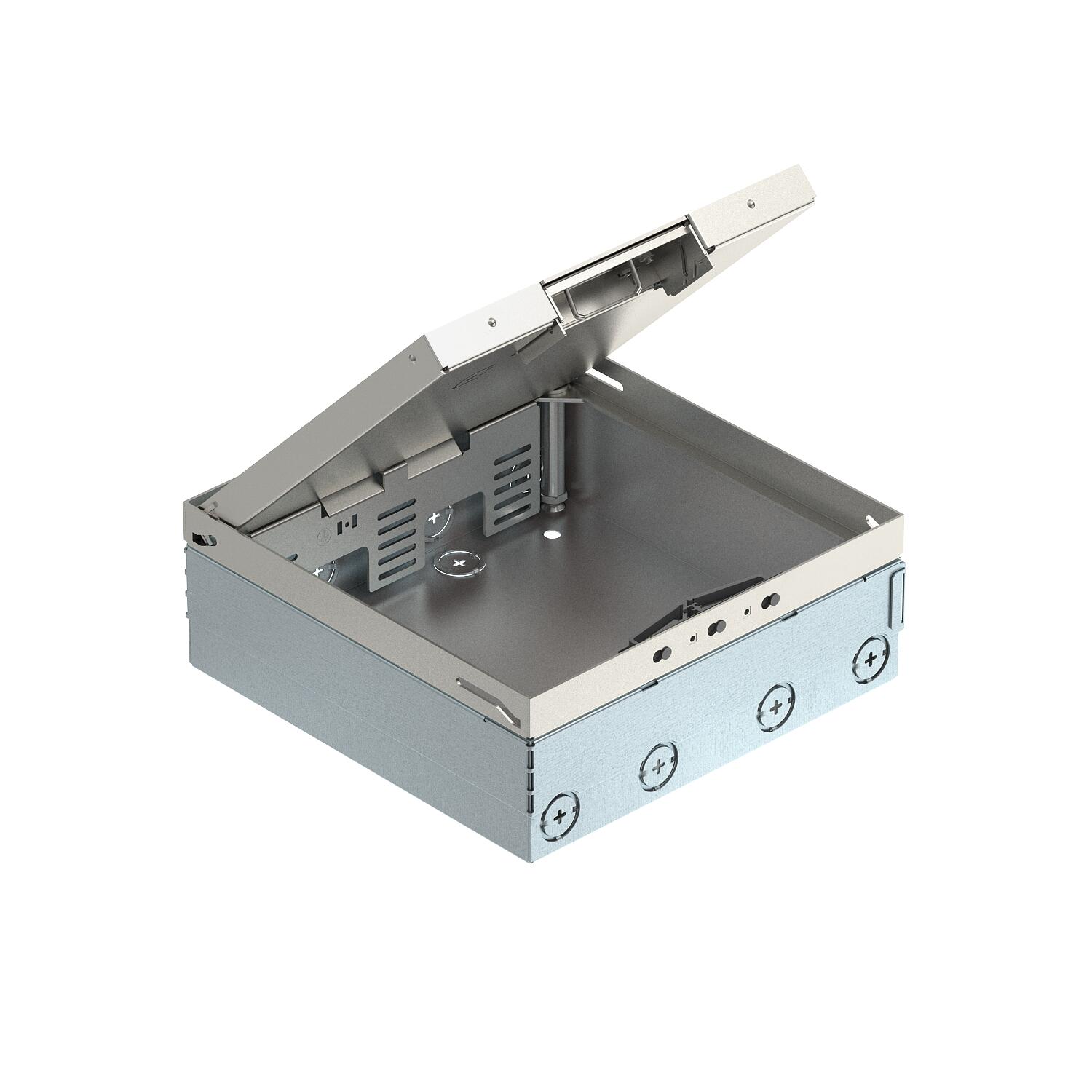 Description du produitBoîte de sol carrée pour une utilisation dans des planchers creux et des chapes nettoyés à sec, utilisation à l'intérieur. Boîtier d’encastrement avec pré-poinçonnage des ouvertures pour tuyaux (M25). Boîtier vide pour jusqu'à 3 supports universels UT4 pour jusqu'à 12 appareillages encastrables Modul 45®. Couvercle réglable à l’aide de 4 supports de nivellement sur le rebord supérieur du revêtement de sol. La profondeur d'encastrement minimale est de 95 mm, la plage de réglage + 30 mm.