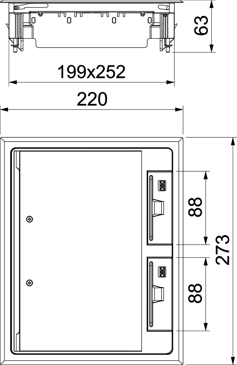 Avec évidement pour l'insertion du revêtement de sol oui Cadre de protection du revêtement de sol oui Charge verticale, grande surface jusqu'à 3 000 N Charge verticale, petite surface jusqu'à 2 500 N Compatible avec le conduit fermé affleurant avec la chape non Compatible avec le conduit noyé dans la chape oui Convient pour goulotte noyée oui convient pour montage dans des faux-planchers oui Convient pour montage dans plancher technique oui Convient pour nettoyage à l'eau non Couleur noir graphite ; RAL 9011 Dimension 273x220x61 Dimension h 73 mm Dimension nominale pour boîtier d'appareillages 6 Empreinte CO2 (GWP) du berceau à la porte 1,8068 kg CO2e / 1 Pièce Entretien du sol sécher Épaisseur du revêtement de sol 5 mm Hauteur de plancher min. 73 mm Homologations NF Indice de protection (IP) en utilisation IP20 Indice de protection (IP) hors utilisation IP40 Indice de protection code IK IK08 Largeur cote de montage 252 mm Largeur dimensions extérieures 273 mm Longueur cote de montage 199 mm Longueur dimensions extérieures 220 mm Matériau Polyamide Mécanisme d'ouverture poignée étrier Modèle rectangulaire Modèle de cadre Cadre de protection de moquette Modèle pour charges lourdes non Modèle Sortie de câble Sortie de cordon pivotante Nombre d'appareillages montables 9 Nombre de paniers support appareillage 3 Plage de serrage D max. 31 mm Plage de serrage D min. 9 mm Possibilité d'installation du joint non Profondeur de montage 73 mm Support d'appareillage pour le logement de paniers appareillage oui Type du système d'encastrement MT3 / GB2 - Tous les types
