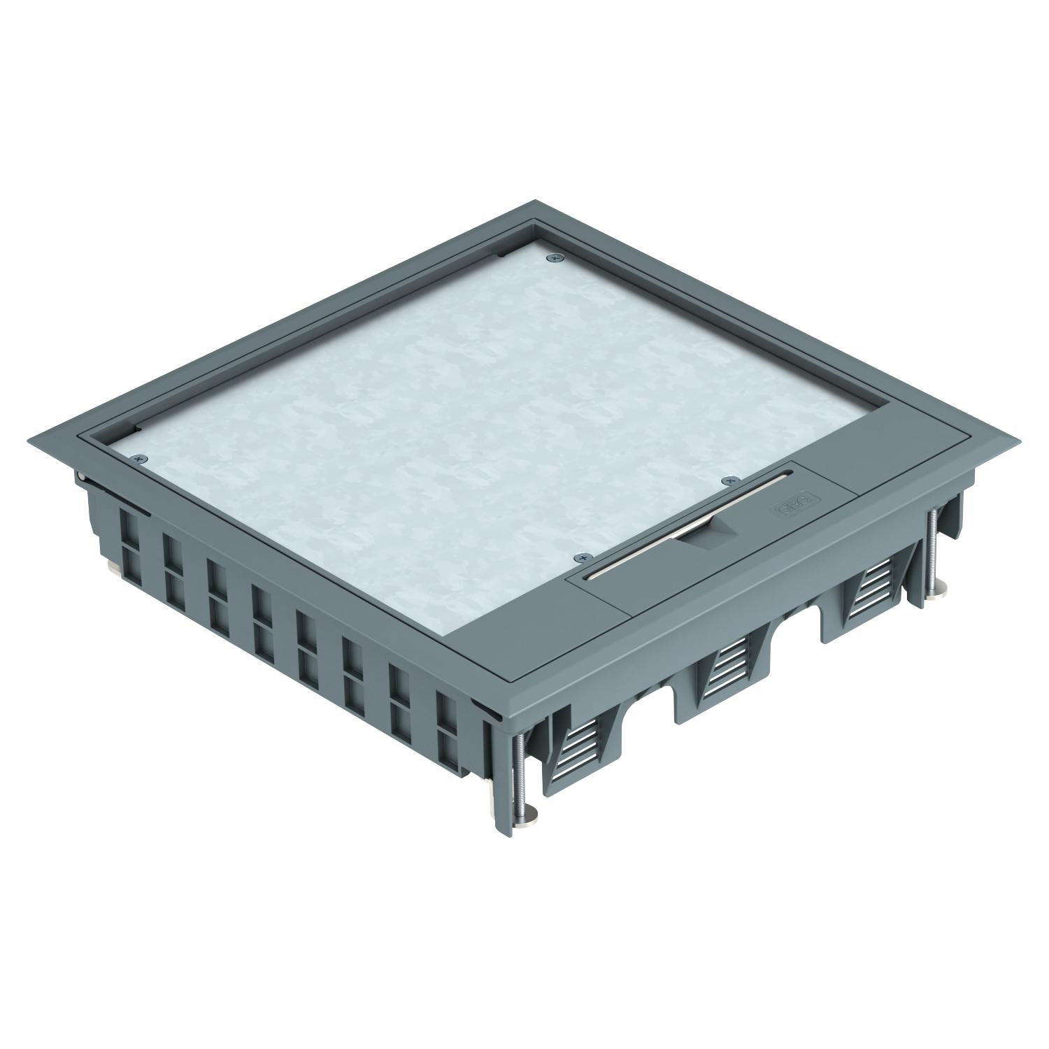 Boîtier de sol avec poignée étrier, 3 compartiments, pour la pose du support de montage MT9. Il est possible d'installer 3 plaques de recouvrement de forme APMT5. La profondeur de l'évidement du revêtement de sol dans le couvercle à charnière et de 5 mm par défaut, réglable à 10 mm si nécessaire.