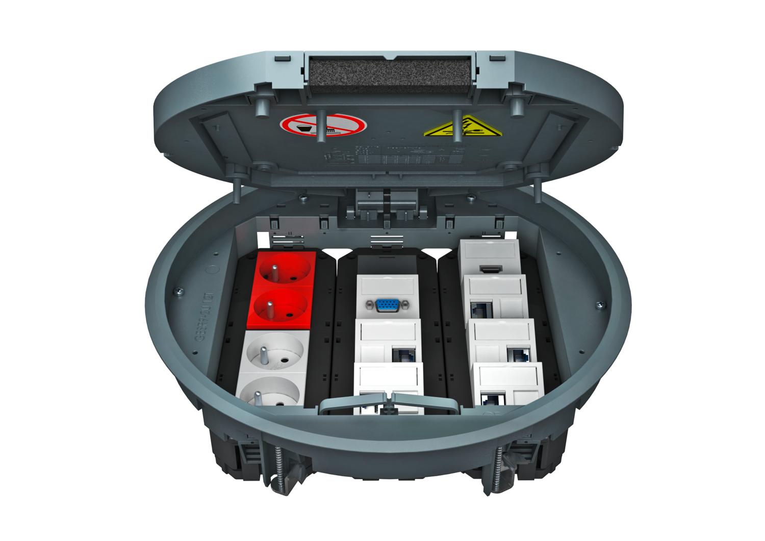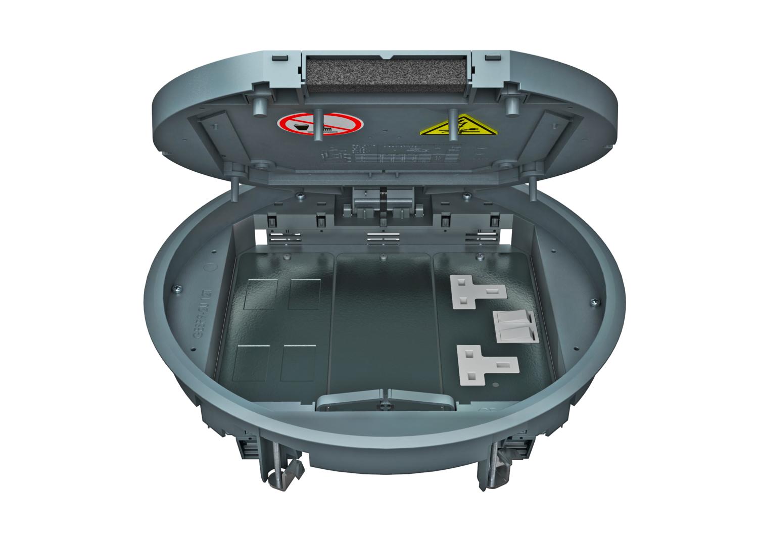 Boîtier de sol avec coulisseau d'arrêt, 3 compartiments, pour la pose des supports de montage MT9. Il est possible d'installer 3 plaques de recouvrement de forme APMT5.