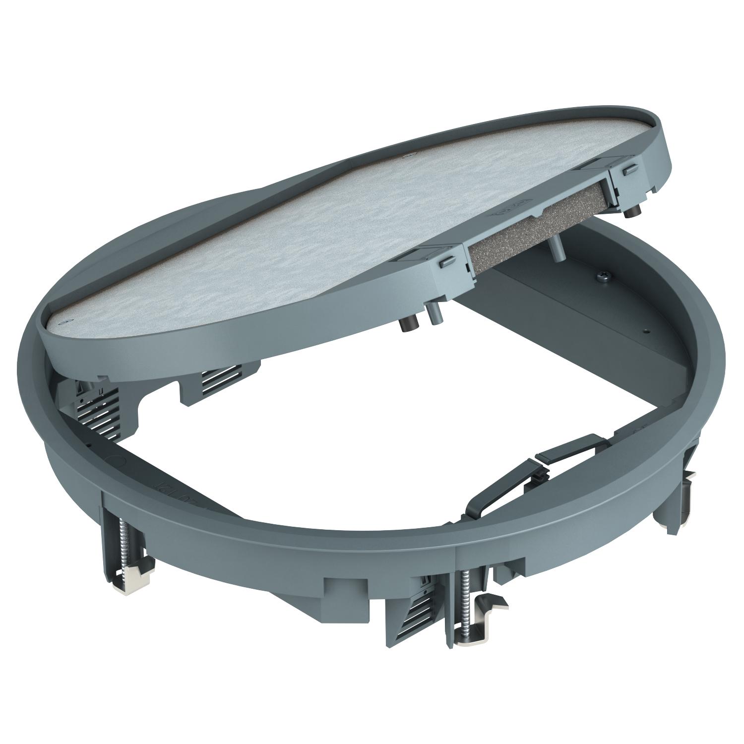 Évidement prédéfini de 5 mm pour l'insertion du revêtement de sol dans le couvercle rabattable, réglage possible sur 3, 10 ou 12 mm si nécessaire.