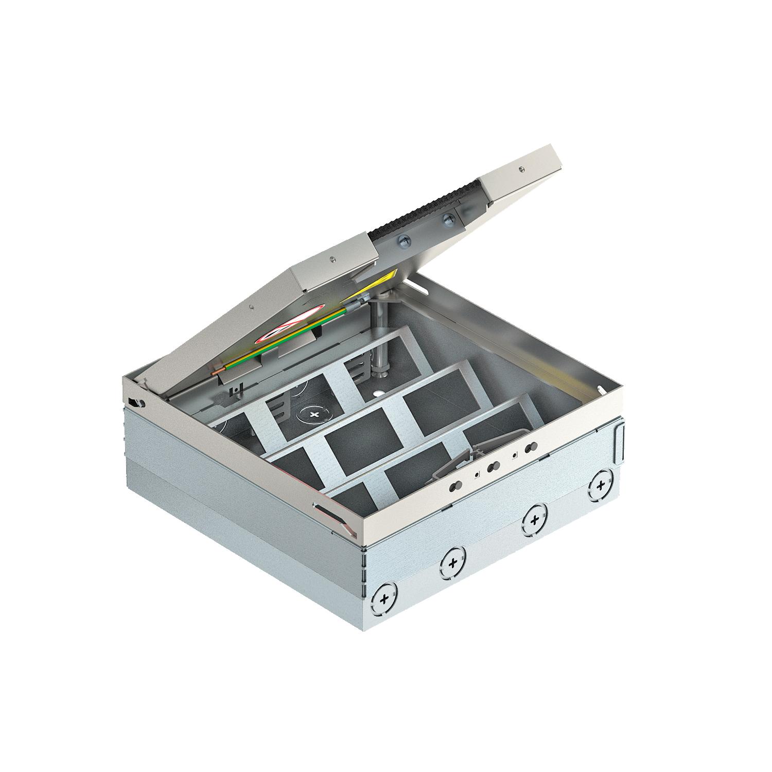 Description du produitBoîtier de sol carré pour une utilisation dans des planchers creux et des chapes nettoyées à sec à l'intérieur.