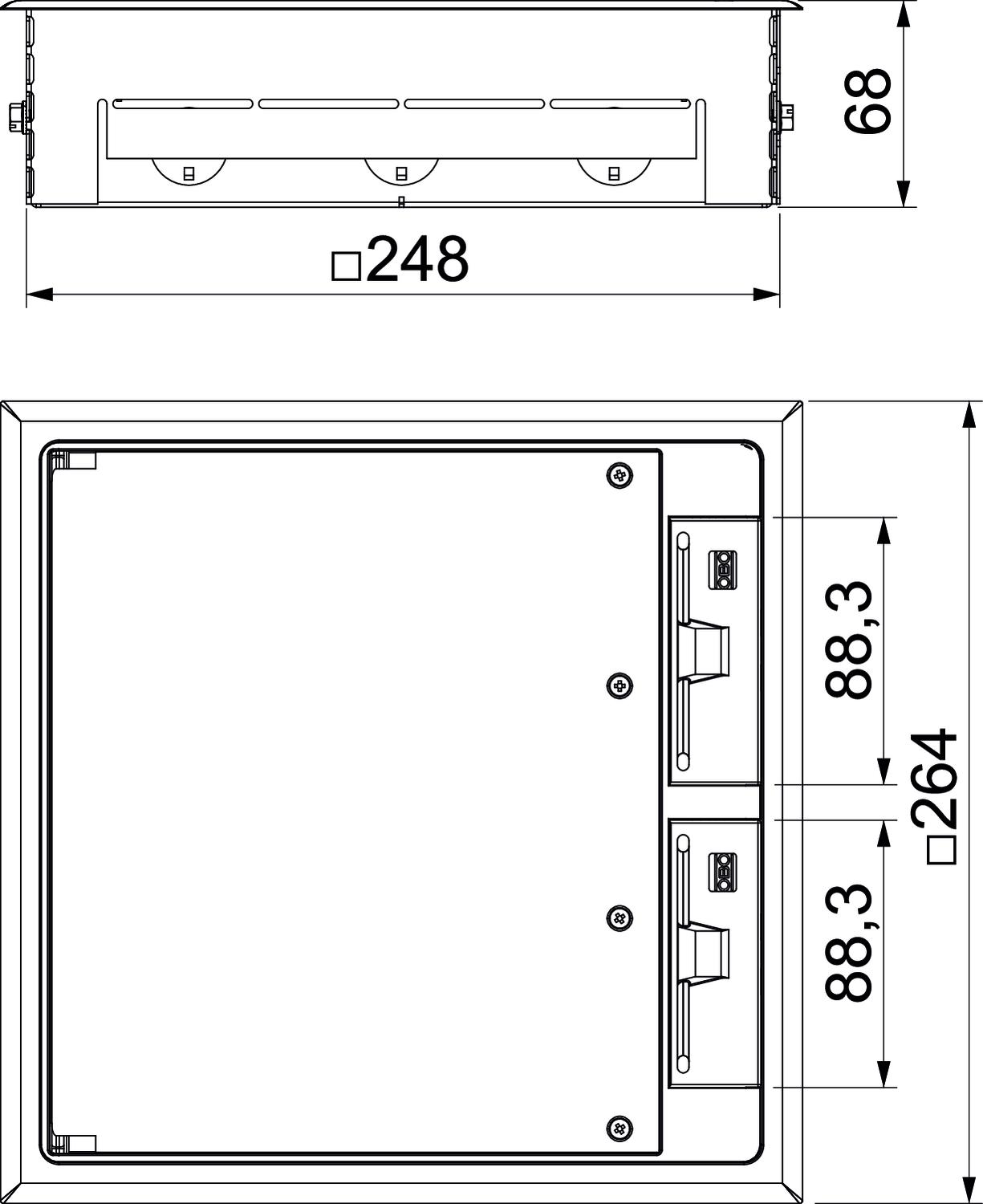 Description du produitBoîte sous chape carrée avec boîtier de sol GES9 UGE pour installation dans des chapes en intérieur. Avec ouvertures d'insertion prédécoupées pour canalisations (M20/M25), sur les quatre côtés.