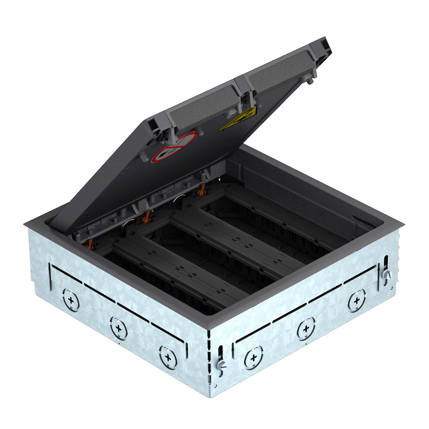 Description du produitBoîte sous chape carrée avec boîtier de sol GES9 pour installation dans des chapes en intérieur. Avec ouvertures d'insertion défonçables pour tubes (M25), sur les quatre côtés.