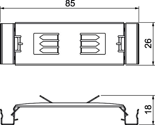Couleur zinc Dimension 85x26x18 Hauteur 18 mm Indice de protection IP30 Indice de protection code IK IK07 Largeur 26 mm Longueur 85 mm Matériau Acier Modèle compensation de potentiel goulotte d’appareillage Ressort de friction Plage de températures d’utilisation max. 60 °C Plage de températures d’utilisation min. -5 °C Surface galvanisé par bande - Tous les types