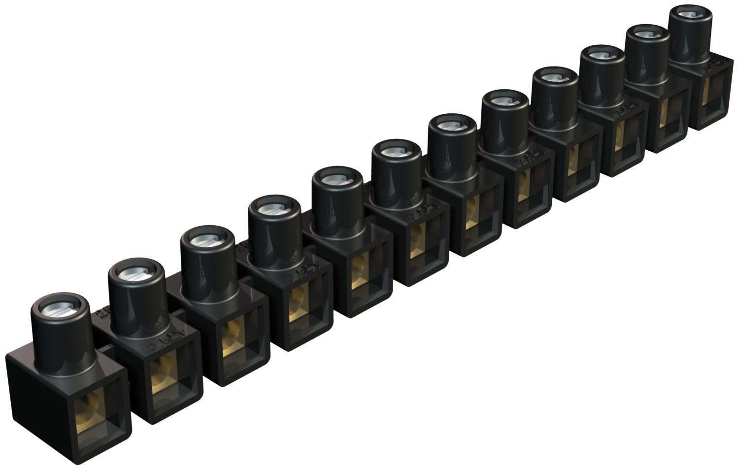 Bornes en laiton, vis en acier, galvanisées (passivation transparente), bornier à 12 pôles composé de bornes individuelles séparables, ouvert d'un côté uniquement.Fermeture unilatérale, vis desserrées imperdables.