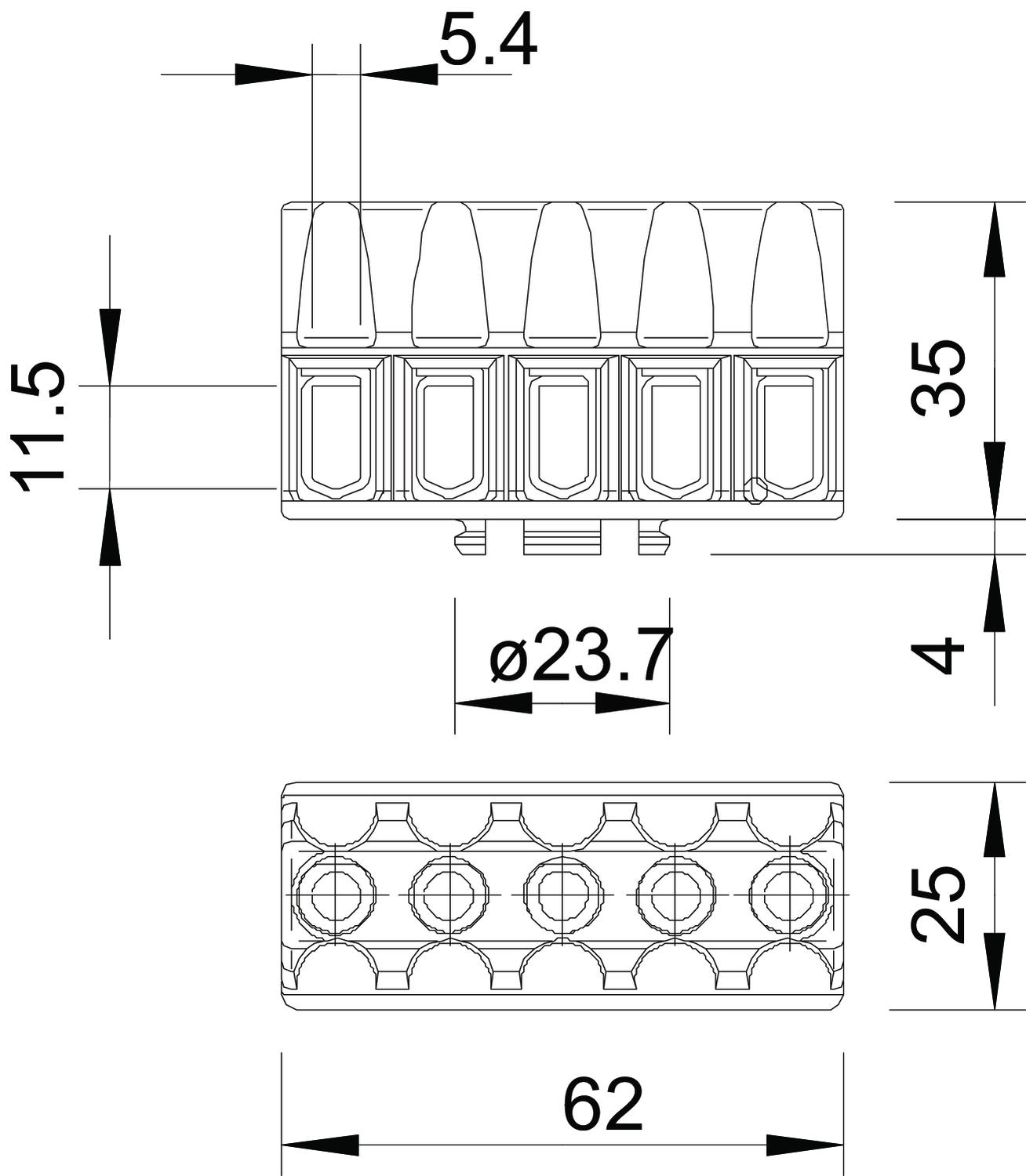 Description du produitBornes et vis en acier, galvanisées (passivation transparente), section nominale 1,5 ÷ 6 mm², tension nominale 400 V, à 5 pôles, avec bornes à douilles, sections de raccordement maximales par point de raccordement: 3x6 mm², 4x4mm² ou 6x2,5 mm².