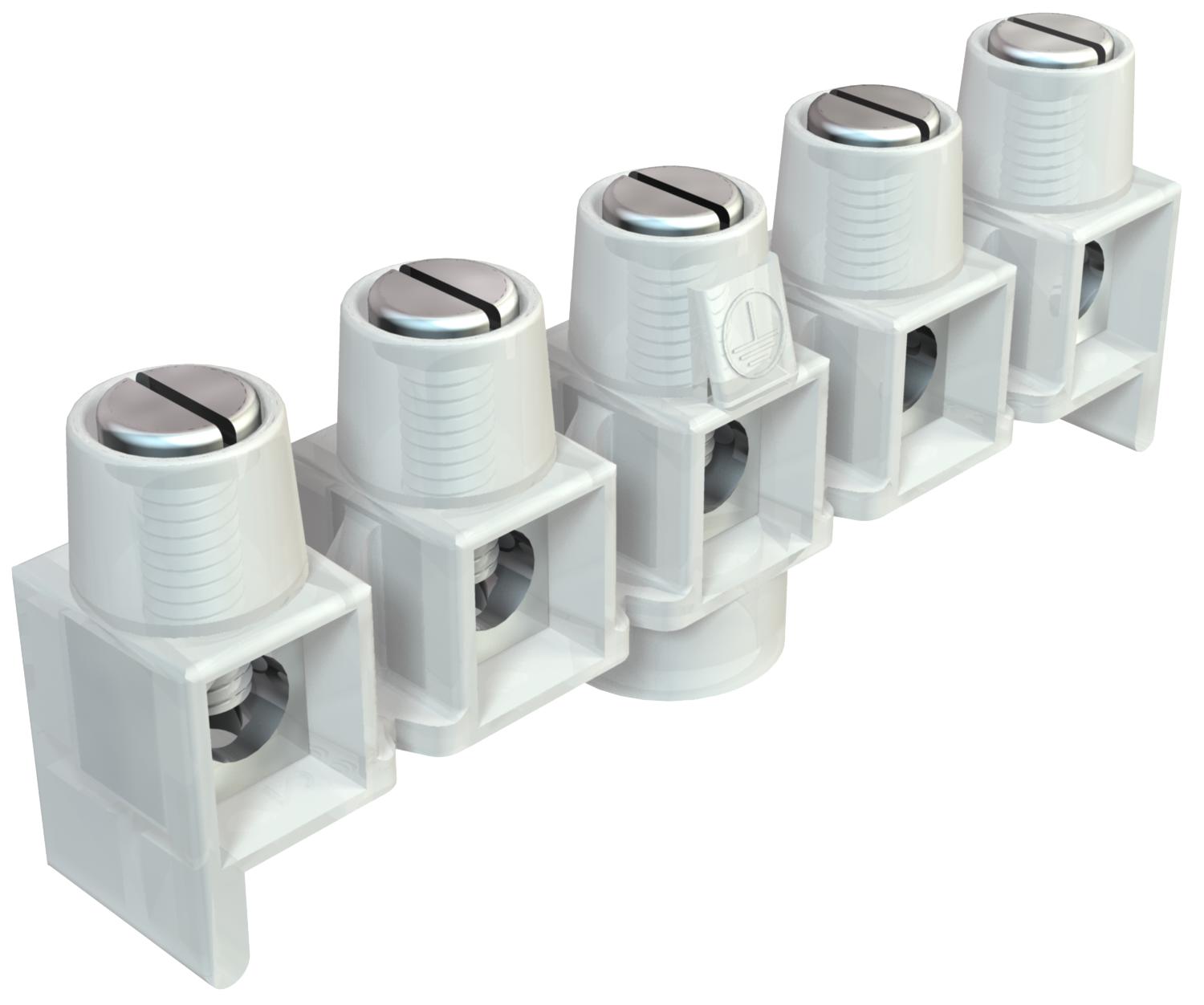 Description du produitBornes en laiton nickelé, vis en acier, galvanisées (passivation transparente), section nominale 0,8 ÷ 2,5 mm², tension nominale 660 V, à 5 pôles, avec bornes à douilles, sections de raccordement maximales par point de connexion : 4 x 2,5 mm², 5 x 1,5 mm² ou 6 x 1 mm², les pôles superflus peuvent être séparés et être utilisés comme une borne individuelle.