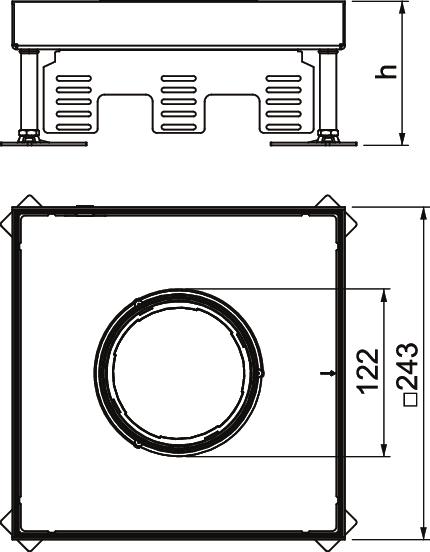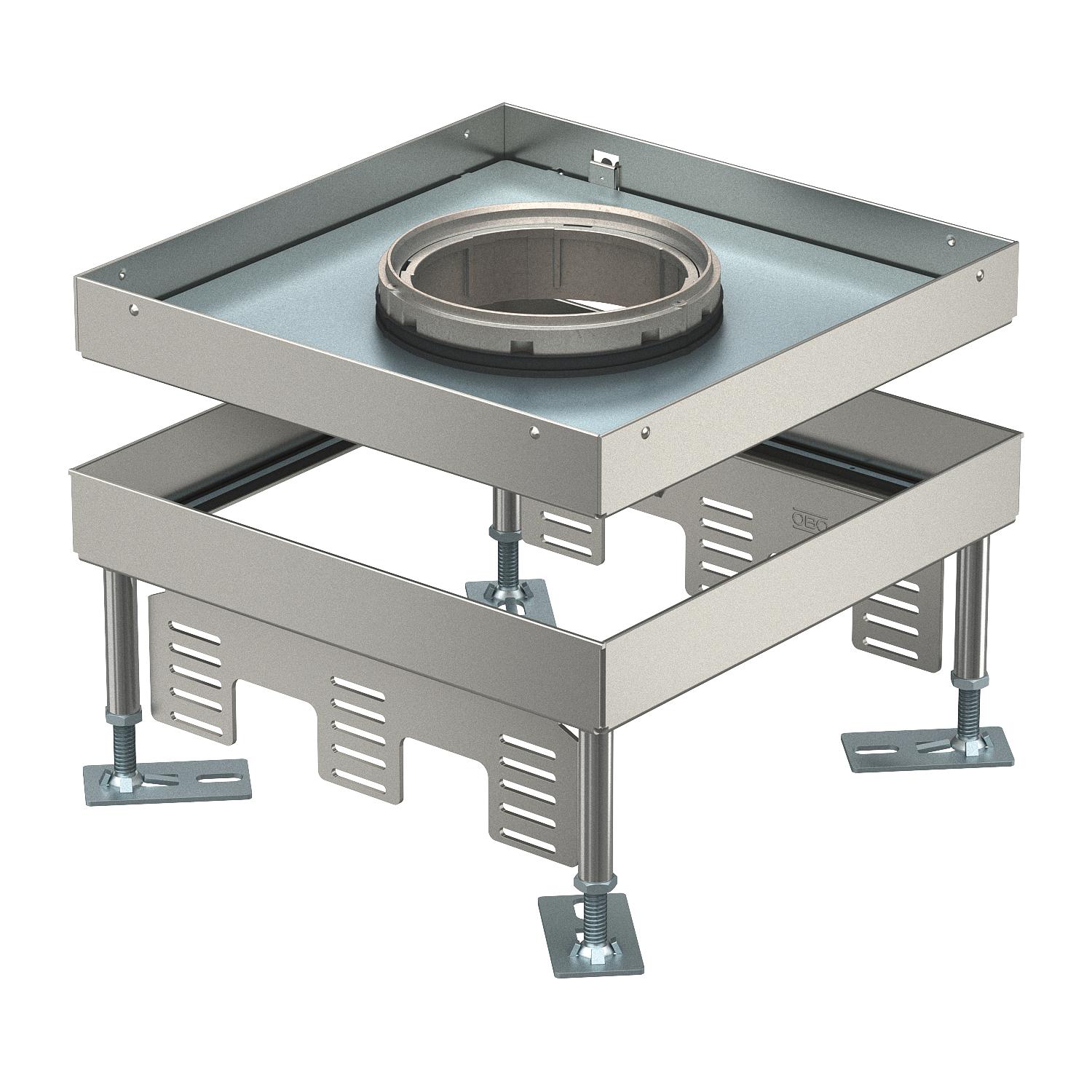 Cassette carrée pour charges lourdes réglable en hauteur pour tube de taille nominale 9 pour le montage d'appareillages dans des systèmes de goulottes, des faux-planchers et des planchers creux, dans des planchers nettoyés à l'eau ou à sec en intérieur. Classe de charge 1 jusqu'à 10 kN.