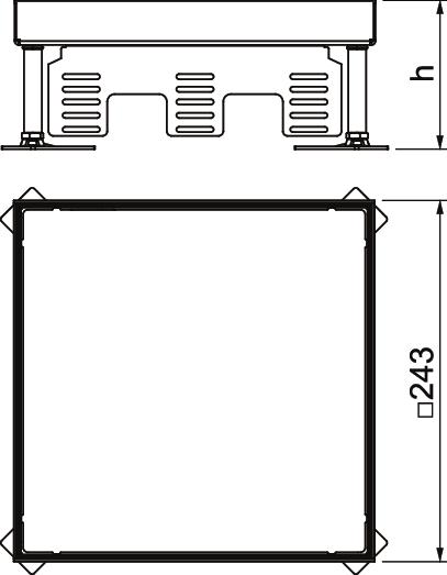 Charge verticale, grande surface jusqu'à 5 000 N Charge verticale, petite surface jusqu'à 3 000 N convient pour montage dans des faux-planchers oui Convient pour montage dans plancher technique oui Découpe de sol/Ouverture de montage 244x244 Découplable non Dimension 243x243x100 Dimension h 105 mm Dimension nominale pour boîtier d'appareillages 9 Empreinte CO2 (GWP) du berceau à la porte 20,3725 kg CO2e / 1 Pièce Entretien du sol humide Épaisseur du revêtement de sol 20 mm Hauteur 105 mm Hauteur de plancher max. 150 mm Hauteur de plancher min. 105 mm Homologations NF Indice de protection (IP) en utilisation IP00 Indice de protection (IP) hors utilisation IP55 Indice de protection code IK IK10 Largeur 243 mm Largeur cote de montage 244 mm Longueur 243 mm Longueur cote de montage 244 mm Matériau Acier inoxydable Modèle carré Modèle pour charges lourdes non Modèle Sortie de câble Aucune sortie de câble Nombre de supports universels 3 x UT4 Norme EN 50085-2-2 Plage de réglage max. 150 mm Plage de réglage min. 105 mm Profondeur de montage 105 mm Support d'appareillage pour le logement de paniers appareillage non Type du système d'encastrement UT4 - Tous les types