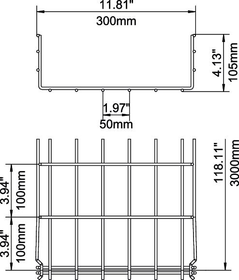 Aucune éclisse supplémentaire n'est nécessaire pour le chemin de câbles en treillis, il est simplement emboîté. Le maillage est de 50 x 100 mm.