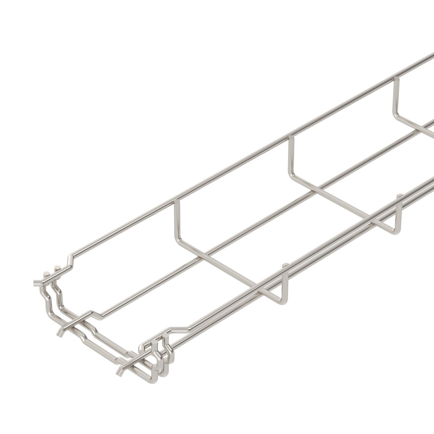 Aucune éclisse supplémentaire n'est nécessaire pour le chemin de câbles en treillis, il est simplement emboîté. Le maillage est de 50 x 100 mm (exception : GRM 35/50 = 20 x 100 mm).