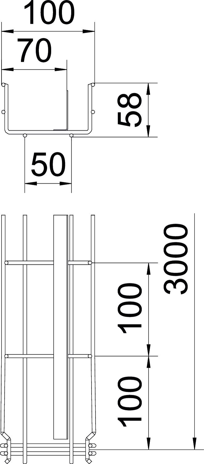 Aucune éclisse supplémentaire n'est nécessaire pour le chemin de câbles en treillis, il est simplement emboîté. Le maillage est de 50 x 100 mm.