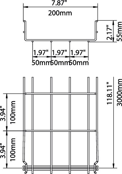 Aucune éclisse supplémentaire n'est nécessaire pour le chemin de câbles en treillis, il est simplement emboîté. Le maillage est de 50 x 100 mm (exception : GRM 55/50 = 20 x 100 mm).