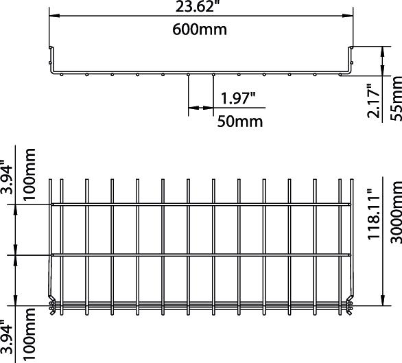 Aucune éclisse supplémentaire n'est nécessaire pour le chemin de câbles en treillis, il est simplement emboîté. Le maillage est de 50 x 100 mm (exception : GRM 55/50 = 20 x 100 mm).