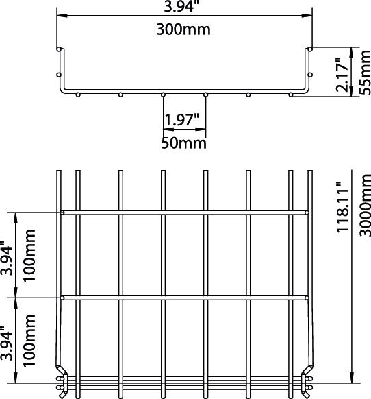 Aucun raccord supplémentaire n'est nécessaire pour le chemin de câbles en treillis, il est simplement emboîté. Le maillage est de 50 x 100 mm (exception : GRM 55/50 = 20 x 100 mm).
