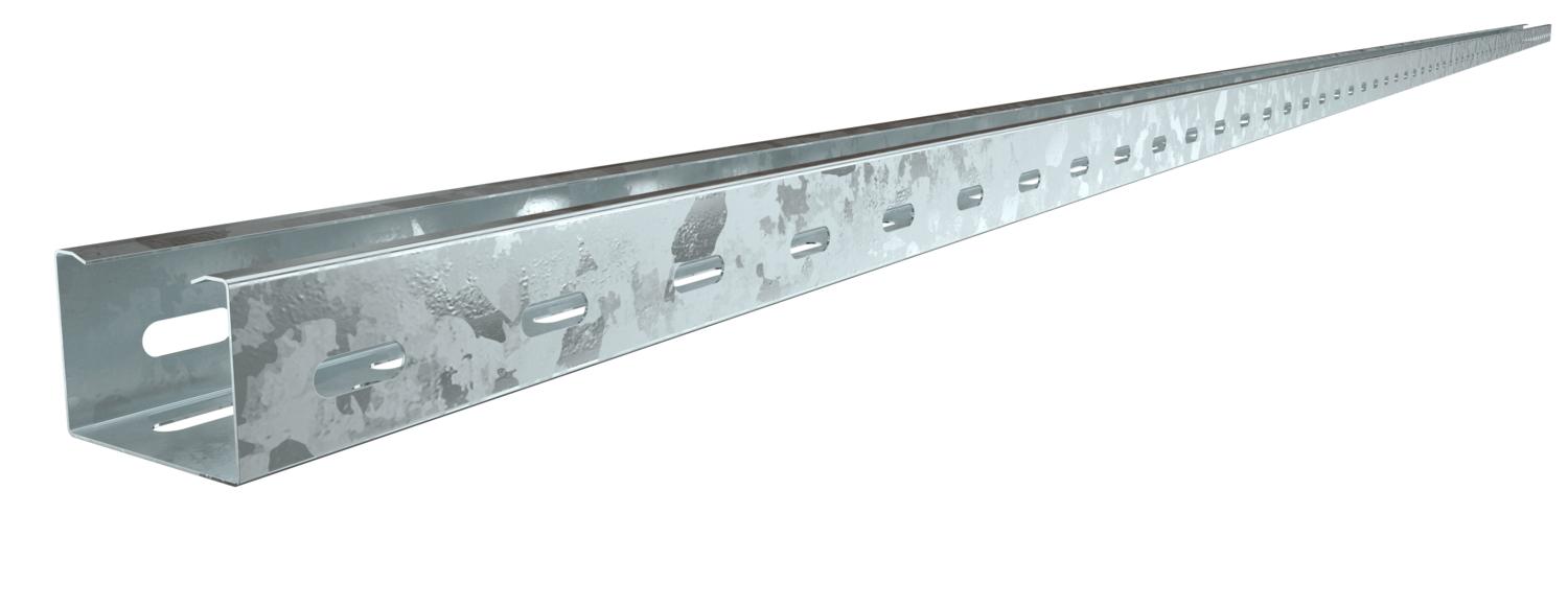 Chemin de câbles avec fond et côtés perforés en continu et trou central (Ø 11 mm) dans le fond pour des fixations supplémentaires.
