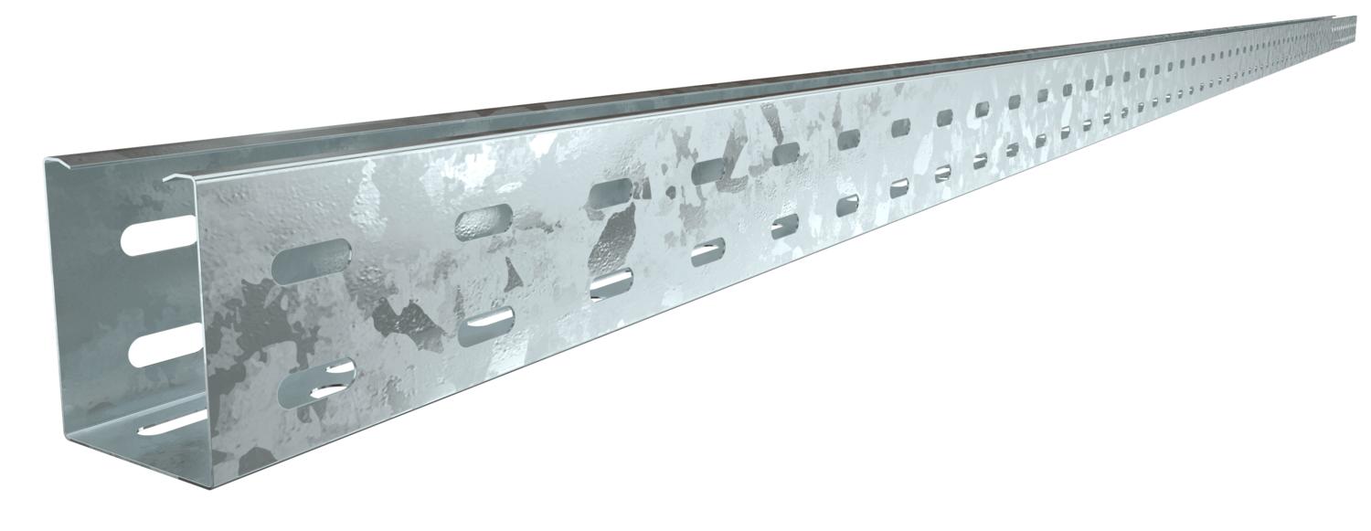 Chemin de câbles avec fond et côtés perforés en continu et trou central (Ø 11 mm) dans le fond pour des fixations supplémentaires.