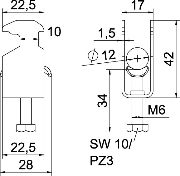 Description du produitClamp clip with hammerhead foot, metal pressure sleeve with rounded edges to protect the cable. For vertical and horizontal mounting of 1 single cable on a C-profile rail. For a slot width 16–17 mm. With 1-start screw thread on pressure sleeve, universal hexagonal screw head WAF10, with slot and cross recess. Suitable for assembly indoors and outdoors. The counter-sleeve must be ordered separately.