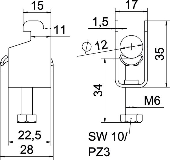 Description du produitClamp clip with N-foot, metal pressure sleeve with rounded edges to protect the cable. For vertical and horizontal mounting of 1 single cable on a C-profile rail. For slot width 11‒12 mm With 1-start screw thread on pressure sleeve, universal hexagonal screw head WAF10, with slot and cross recess. Suitable for assembly indoors and outdoors. We recommend the use of a counter-sleeve.