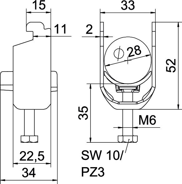 Description du produitClamp clip with N-foot, plastic pressure sleeve made of polypropylene. For vertical and horizontal mounting of 1 single cable on a C-profile rail. For slot width 11‒12 mm With 1-start screw thread on pressure sleeve, universal hexagonal screw head WAF10, with slot and cross recess. Suitable for assembly indoors and outdoors. We recommend the use of a counter-sleeve.
