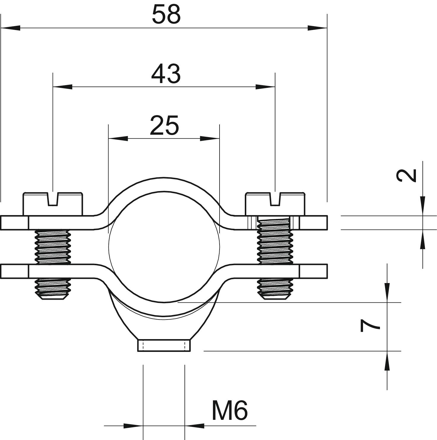 Avec gaine en matière plastique non Convient pour les espaces coupe-feu non Cote A 58 mm Cote B 43 mm Cote D 25 mm Cote t 2 mm Dimension 20-25mm Dimension d min. 25 mm Dimension du trou M6 mm Empreinte CO2 (GWP) du berceau à la porte 0,0861 kg CO2e / 1 Pièce Épaisseur du matériau 2 mm Longueur 58 mm Matériau Acier Modèle fermé Nombre de câbles/tubes 1 Plage de serrage D max. 25 mm Plage de serrage D min. 20 mm Résistant aux UV oui Sans halogène non Surface galvanisé Type de fixation Trou de vis Vis M5 x 14 - Tous les types