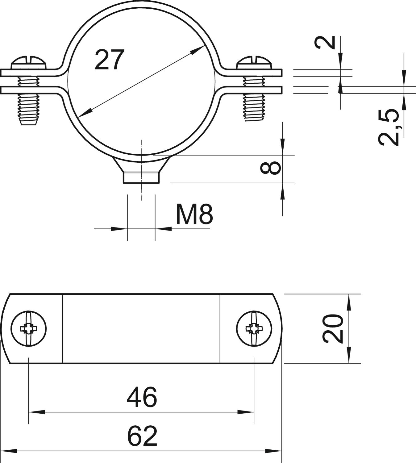 Avec gaine en matière plastique non Convient pour les espaces coupe-feu non Cote A 62 mm Cote B 46 mm Cote D 27 mm Cote t 2 mm Cote x 2,5 mm Dimension 3/4" Dimension d min. 27 mm Dimension du trou M8 mm Dimension t1 (mm) 2,5 Empreinte CO2 (GWP) du berceau à la porte 0,1428 kg CO2e / 1 Pièce Épaisseur du matériau 2 mm Filetage M8 Largeur 20 mm Longueur 62 mm Matériau Acier Modèle fermé Plage de serrage D max. 27 mm Plage de serrage D min. 24,5 mm pour diamètre de tube M25 pour un diamètre de 27 Résistant aux UV oui Sans halogène non Surface galvanisé à chaud par trempage Taille 3/4" Type de fixation Trou de vis Vis M6 x 16 - Tous les types