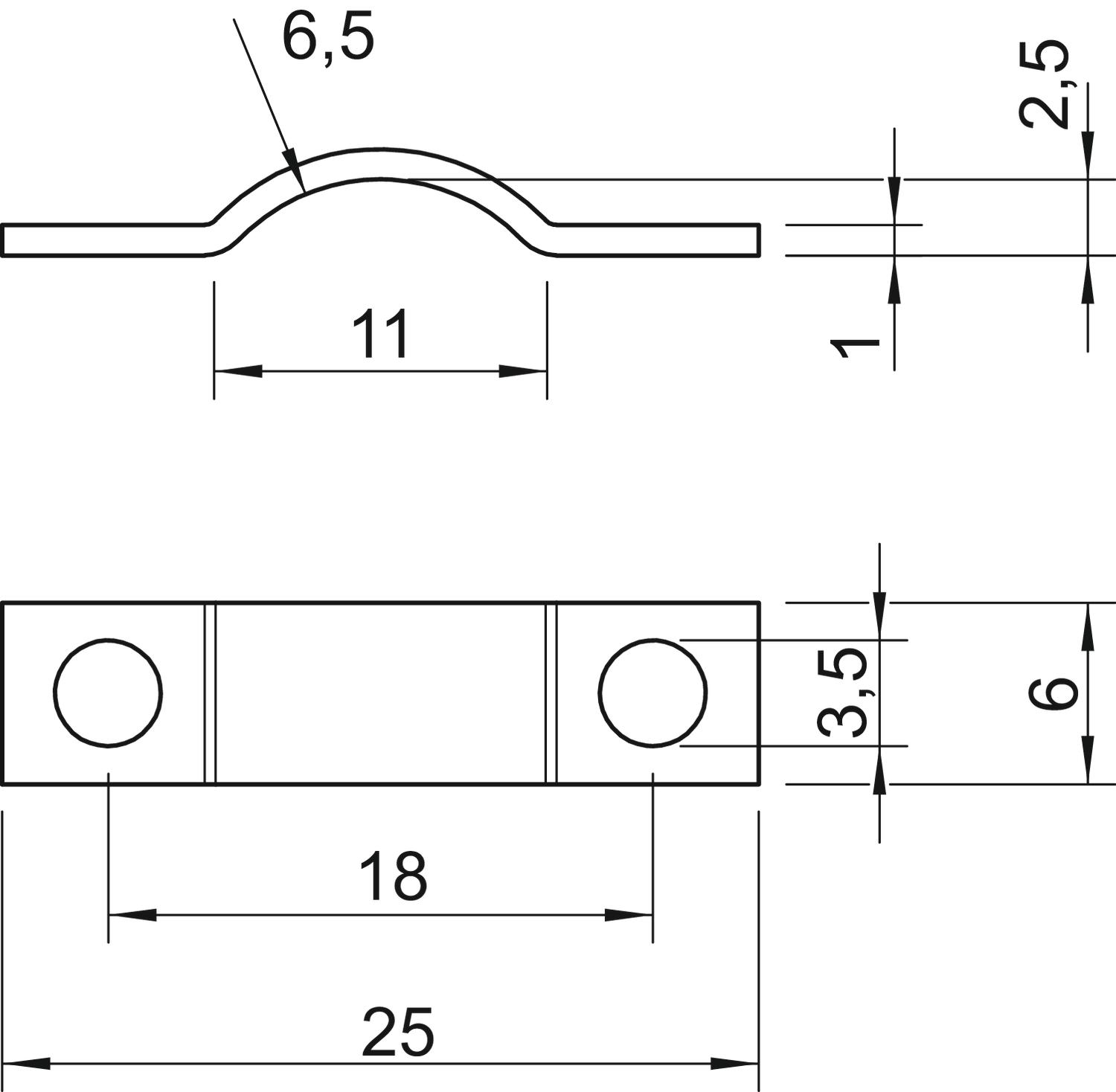 Avec gaine en matière plastique non Convient pour les espaces coupe-feu non Cote a 11 mm Cote b 6 mm Cote d 3,5 mm Cote l 18 mm Cote L 25 mm Cote R 6,5 mm Cote t 1 mm Dimension 6,5mm Dimension du trou 3,5 mm Dimension h 2,5 mm Distance au mur non Empreinte CO2 (GWP) du berceau à la porte 0,0034 kg CO2e / 1 Pièce Épaisseur du matériau 1 mm Hauteur 2,5 mm Largeur 6 mm Longueur 25 mm Matériau Acier Modèle à deux pattes Nombre de câbles/tubes 1 Plage de serrage D max. 6,5 mm Plage de serrage D min. 6,5 mm pour un diamètre de 6,5 Résistant aux UV oui Sans halogène oui Surface galvanisé Type de fixation Trou de vis - Tous les types
