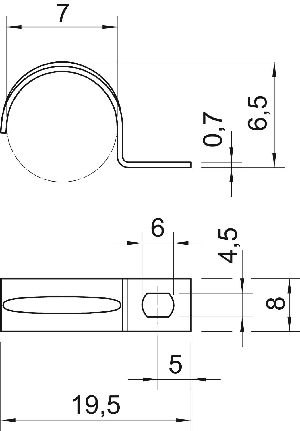 Avec gaine en matière plastique non Convient pour les espaces coupe-feu non Cote A 5 mm Cote b 8 mm Cote D 7 mm Cote d 4,5 mm Cote L 19,5 mm Cote t 0,7 mm Diamètre nominal 7 mm Dimension 7mm Dimension du trou 4,5 x 6 mm Dimension e 6 mm Dimension H 6,5 mm Distance au mur non Empreinte CO2 (GWP) du berceau à la porte 0,0038 kg CO2e / 1 Pièce Épaisseur du matériau 0,7 mm Hauteur 6,5 mm Largeur 8 mm Longueur 19,5 mm Matériau Acier Modèle à une patte Nombre de câbles/tubes 1 pour un diamètre de 7 Résistant aux UV oui Sans halogène oui Surface galvanisé Type de fixation Trou de vis - Tous les types