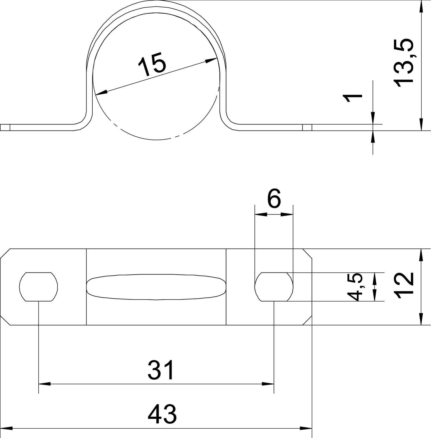 Avec gaine en matière plastique non Convient pour les espaces coupe-feu non Cote A 43 mm Cote B 31 mm Cote b 12 mm Cote d 4,5 mm Cote D 15 mm Cote t 1 mm Diamètre nominal 15 mm Dimension 15mm Dimension du trou 4,5 x 6 mm Dimension e 6 mm Dimension H 13,5 mm Distance au mur non Empreinte CO2 (GWP) du berceau à la porte 0,0123 kg CO2e / 1 Pièce Épaisseur du matériau 1 mm Hauteur 13,5 mm Largeur 12 mm Longueur 43 mm Matériau Acier Modèle à deux pattes Nombre de câbles/tubes 1 pour un diamètre de 15 Résistant aux UV oui Sans halogène oui Surface galvanisé Type de fixation Trou de vis - Tous les types