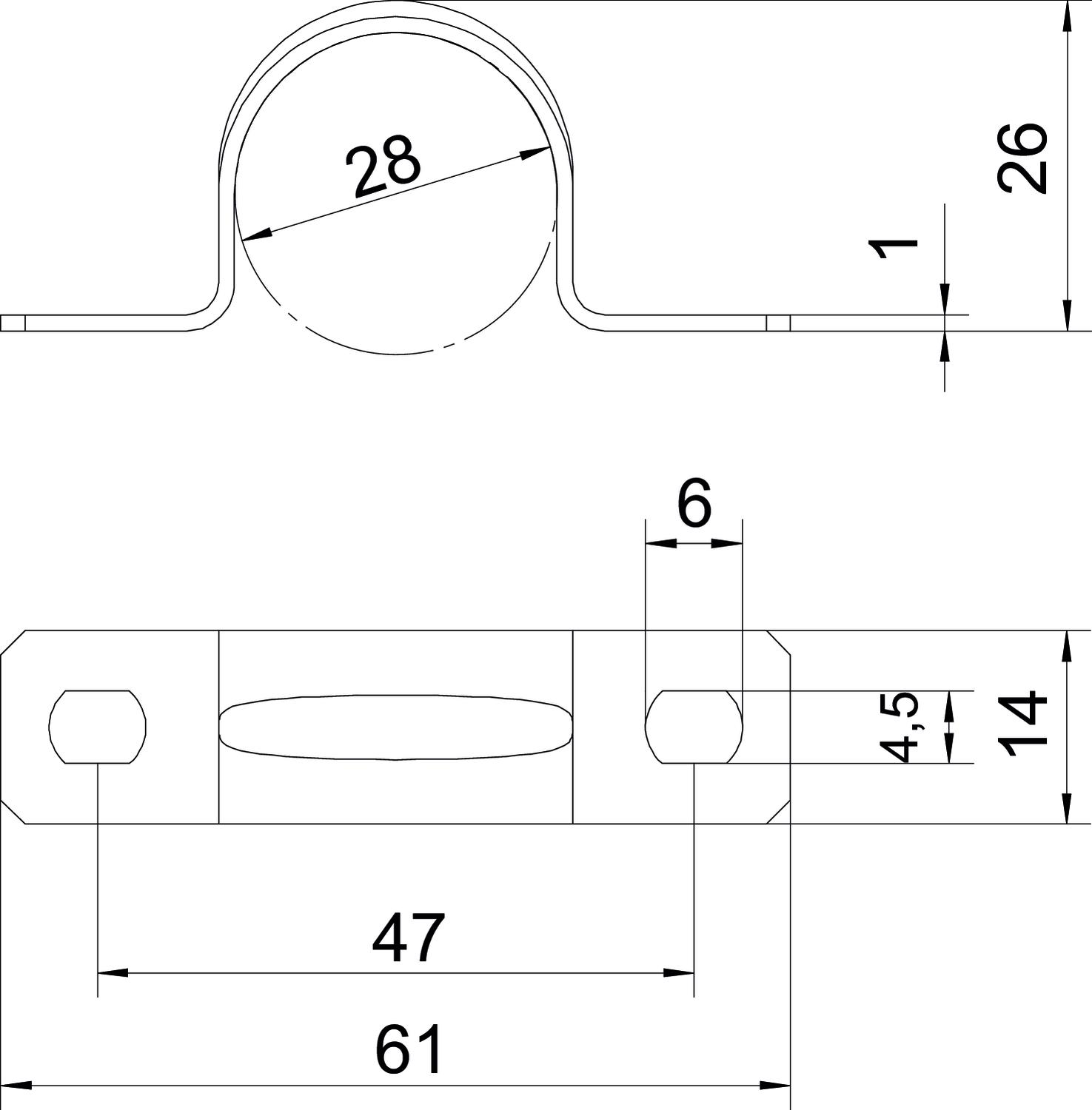 Avec gaine en matière plastique non Convient pour les espaces coupe-feu non Cote A 61 mm Cote B 47 mm Cote b 14 mm Cote d 4,5 mm Cote D 28 mm Cote t 1 mm Diamètre nominal 28 mm Dimension 28mm Dimension du trou 4,5 x 6 mm Dimension e 6 mm Dimension H 26 mm Distance au mur non Empreinte CO2 (GWP) du berceau à la porte 0,0249 kg CO2e / 1 Pièce Épaisseur du matériau 1 mm Hauteur 26 mm Largeur 14 mm Longueur 61 mm Matériau Acier Modèle à deux pattes Nombre de câbles/tubes 1 pour un diamètre de 28 Résistant aux UV oui Sans halogène oui Surface galvanisé Type de fixation Trou de vis - Tous les types