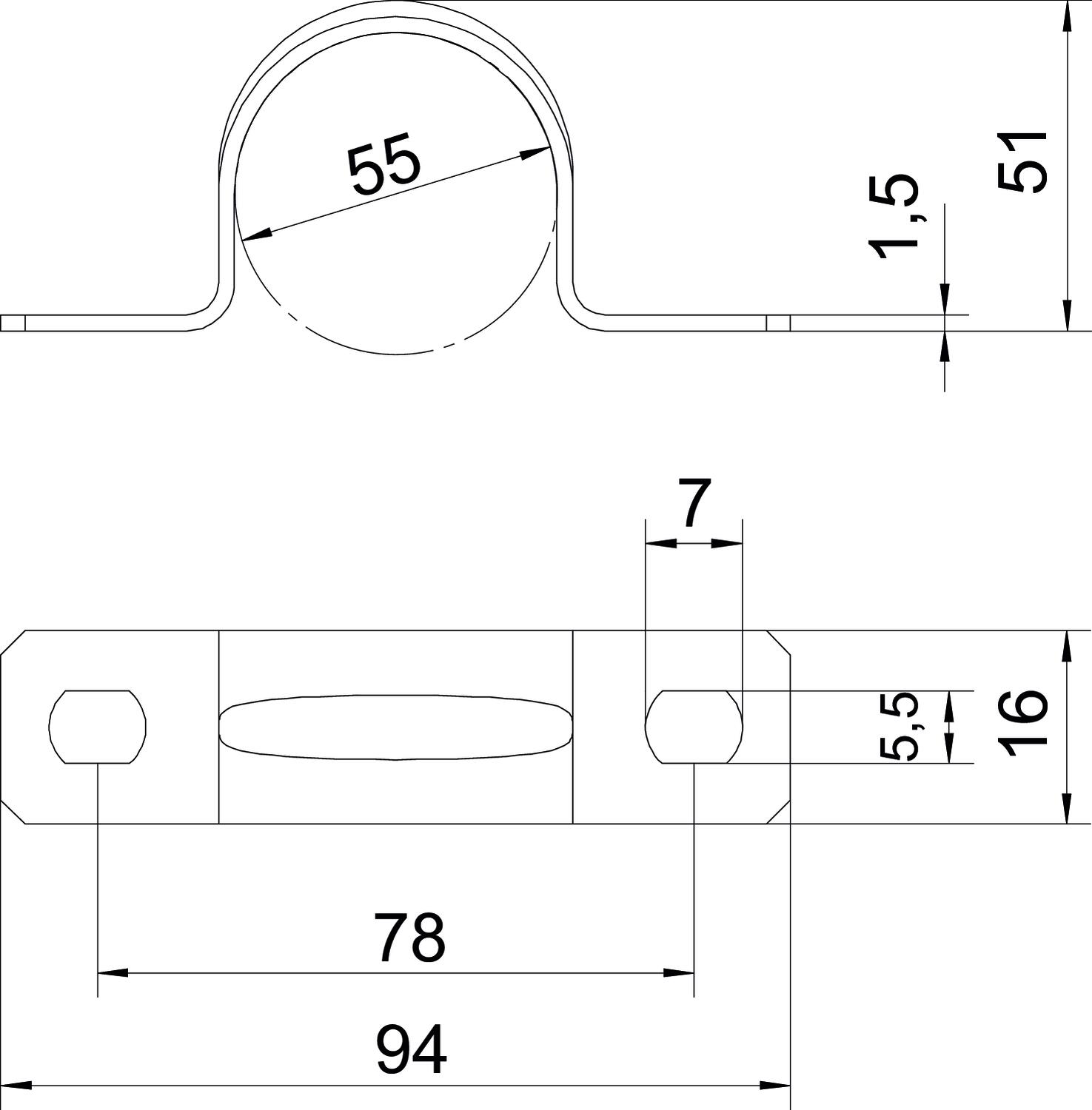Avec gaine en matière plastique non Convient pour les espaces coupe-feu non Cote A 94 mm Cote b 16 mm Cote B 78 mm Cote D 55 mm Cote d 5,5 mm Cote t 1,5 mm Diamètre nominal 55 mm Dimension 55mm Dimension du trou 5,5 x 7 mm Dimension e 7 mm Dimension H 51 mm Distance au mur non Empreinte CO2 (GWP) du berceau à la porte 0,0816 kg CO2e / 1 Pièce Épaisseur du matériau 1,5 mm Hauteur 51 mm Largeur 16 mm Longueur 94 mm Matériau Acier Modèle à deux pattes Nombre de câbles/tubes 1 pour un diamètre de 55 Résistant aux UV oui Sans halogène oui Surface galvanisé Type de fixation Trou de vis - Tous les types