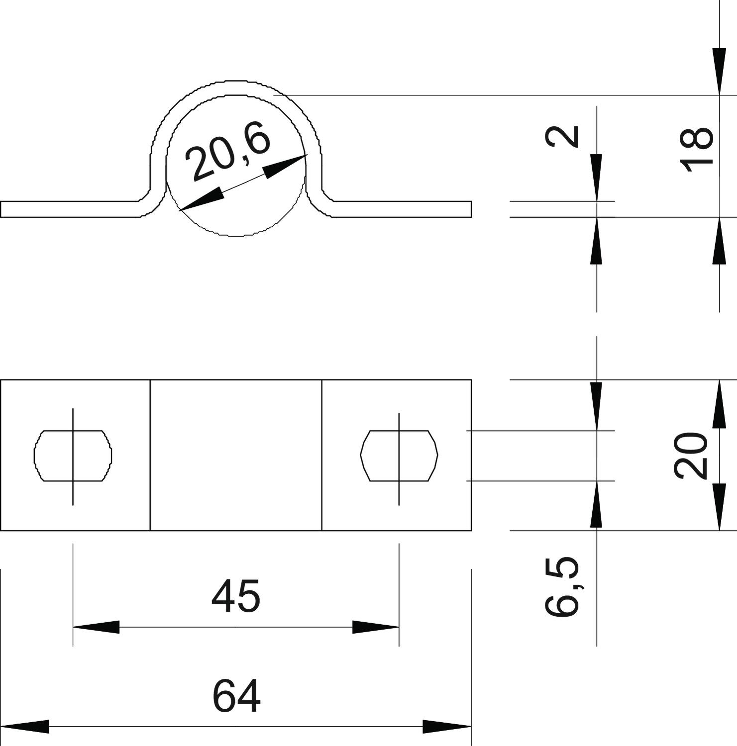 Avec gaine en matière plastique non Convient pour les espaces coupe-feu non Cote A 64 mm Cote b 20 mm Cote B 45 mm Cote D 20,4 mm Cote d 6,5 mm Cote t 2 mm Diamètre nominal 20 mm Dimension 20mm Dimension du trou 6,5 x 10 mm Dimension e 10 mm Dimension H 18 mm Distance au mur non Empreinte CO2 (GWP) du berceau à la porte 0,0624 kg CO2e / 1 Pièce Épaisseur du matériau 2 mm Hauteur 18 mm Largeur 20 mm Longueur 64 mm Matériau Acier Modèle à deux pattes Nombre de câbles/tubes 1 pour un diamètre de 20 Résistant aux UV oui Sans halogène oui Surface galvanisé à chaud par trempage Type de fixation Trou de vis - Tous les types
