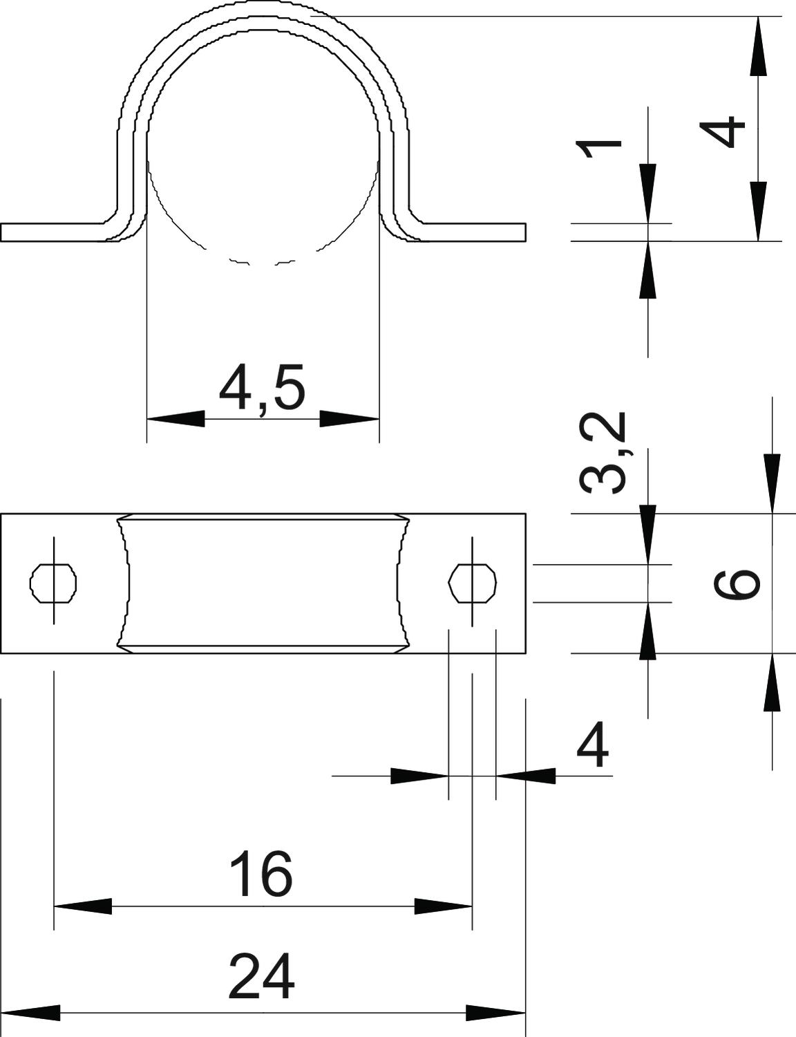 Avec gaine en matière plastique non Convient pour les espaces coupe-feu non Cote A 24 mm Cote B 16 mm Cote b 6 mm Cote d 3,2 mm Cote D 4,5 mm Cote L 24 mm Cote t 1 mm Diamètre nominal 4,5 mm Dimension 4,5mm Dimension du trou 3,2 x 4 mm Dimension e 4 mm Dimension H 4 mm Distance au mur non Empreinte CO2 (GWP) du berceau à la porte 0,003 kg CO2e / 1 Pièce Épaisseur du matériau 1 mm Hauteur 4 mm Largeur 6 mm Longueur 24 mm Matériau Acier Modèle à deux pattes Nombre de câbles/tubes 1 pour un diamètre de 4,5 Résistant aux UV oui Sans halogène oui Surface galvanisé, passivé transparent Type de fixation Trou de vis - Tous les types