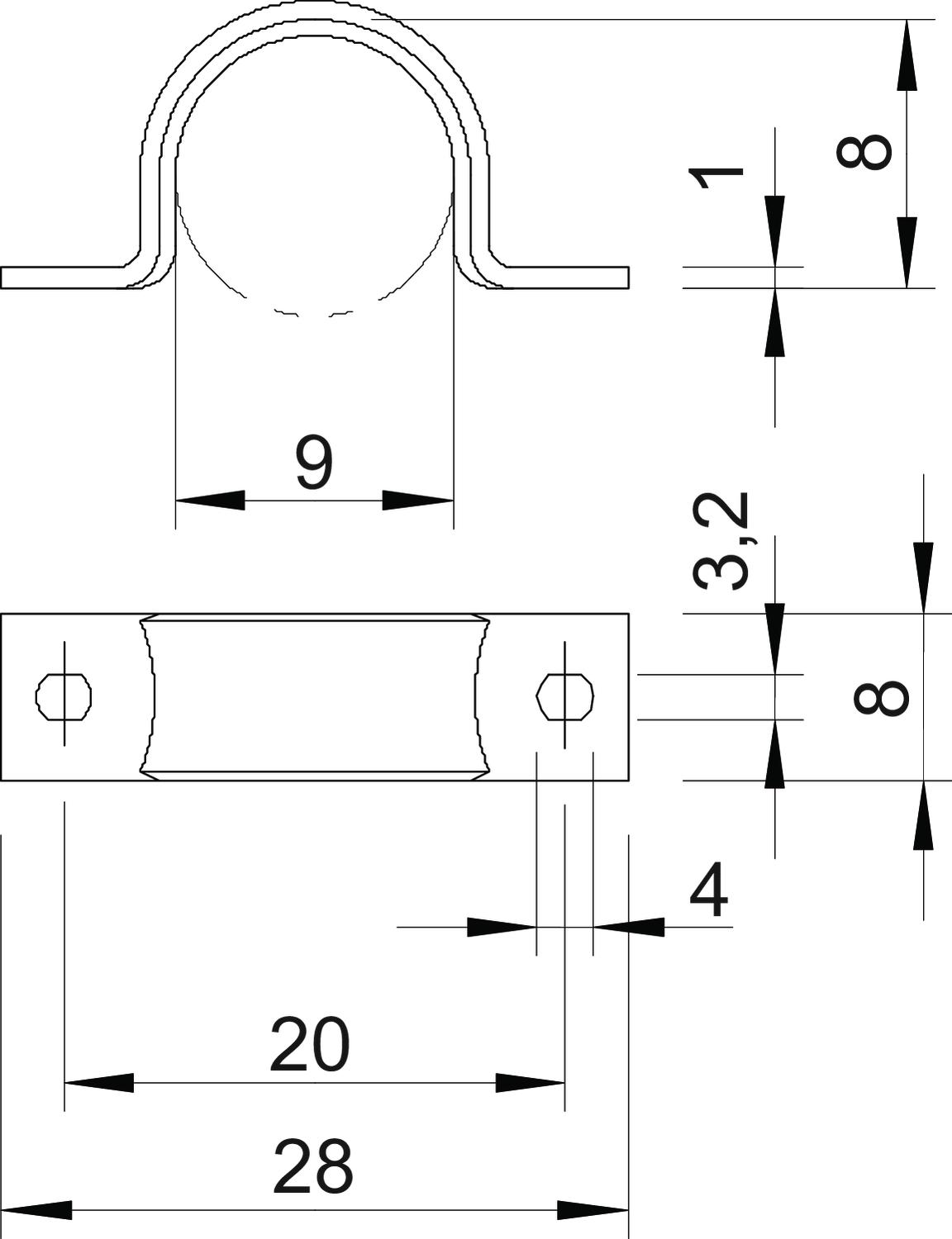Avec gaine en matière plastique non Convient pour les espaces coupe-feu non Cote A 28 mm Cote B 20 mm Cote b 8 mm Cote D 9 mm Cote d 3,2 mm Cote L 28 mm Cote t 1 mm Diamètre nominal 9 mm Dimension 9mm Dimension du trou 3,2 x 4 mm Dimension e 4 mm Dimension H 8 mm Distance au mur non Empreinte CO2 (GWP) du berceau à la porte 0,0052 kg CO2e / 1 Pièce Épaisseur du matériau 1,5 mm Hauteur 8 mm Largeur 8 mm Longueur 28 mm Matériau Acier Modèle à deux pattes Nombre de câbles/tubes 1 pour un diamètre de 9 Résistant aux UV oui Sans halogène oui Surface galvanisé, passivé transparent Type de fixation Trou de vis - Tous les types