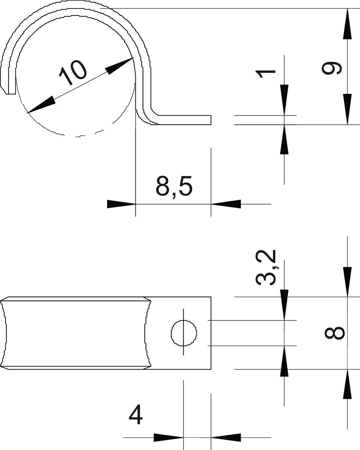Avec gaine en matière plastique non Convient pour les espaces coupe-feu non Cote A 4 mm Cote b 8 mm Cote D 10 mm Cote d 3,2 mm Cote L 8,5 mm Cote t 1 mm Diamètre nominal 10 mm Dimension 10mm Dimension du trou 3,2 mm Dimension H 9 mm Distance au mur non Empreinte CO2 (GWP) du berceau à la porte 0,0044 kg CO2e / 1 Pièce Épaisseur du matériau 1,5 mm Hauteur 9 mm Largeur 8 mm Longueur 8,5 mm Matériau Acier Modèle à une patte Nombre de câbles/tubes 1 pour un diamètre de 10 Résistant aux UV oui Sans halogène oui Surface galvanisé, passivé transparent Type de fixation Trou de vis - Tous les types