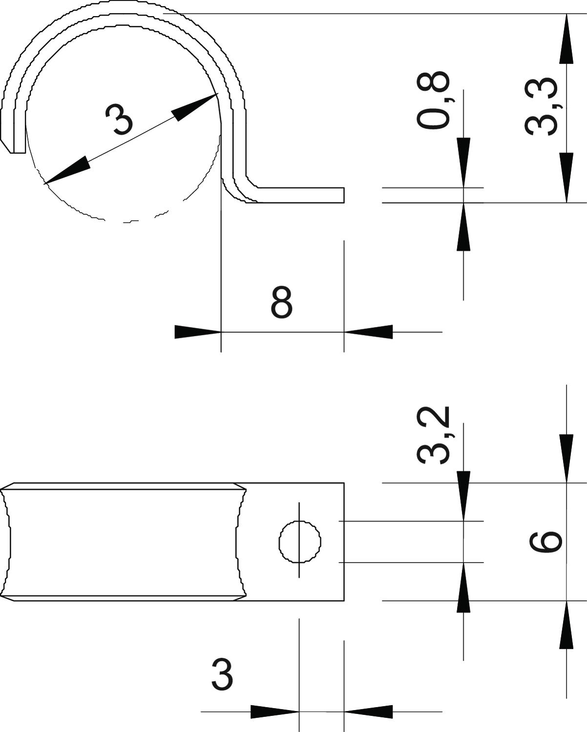 Avec gaine en matière plastique non Convient pour les espaces coupe-feu non Cote A 3 mm Cote b 6 mm Cote D 3 mm Cote d 3,2 mm Cote L 8 mm Cote t 0,8 mm Diamètre nominal 3 mm Dimension 3mm Dimension du trou 3,2 mm Dimension H 3,3 mm Distance au mur non Empreinte CO2 (GWP) du berceau à la porte 0,001 kg CO2e / 1 Pièce Épaisseur du matériau 0,8 mm Matériau Acier Modèle à une patte Nombre de câbles/tubes 1 pour un diamètre de 3 Résistant aux UV oui Sans halogène oui Surface galvanisé, passivé transparent Type de fixation Trou de vis - Tous les types