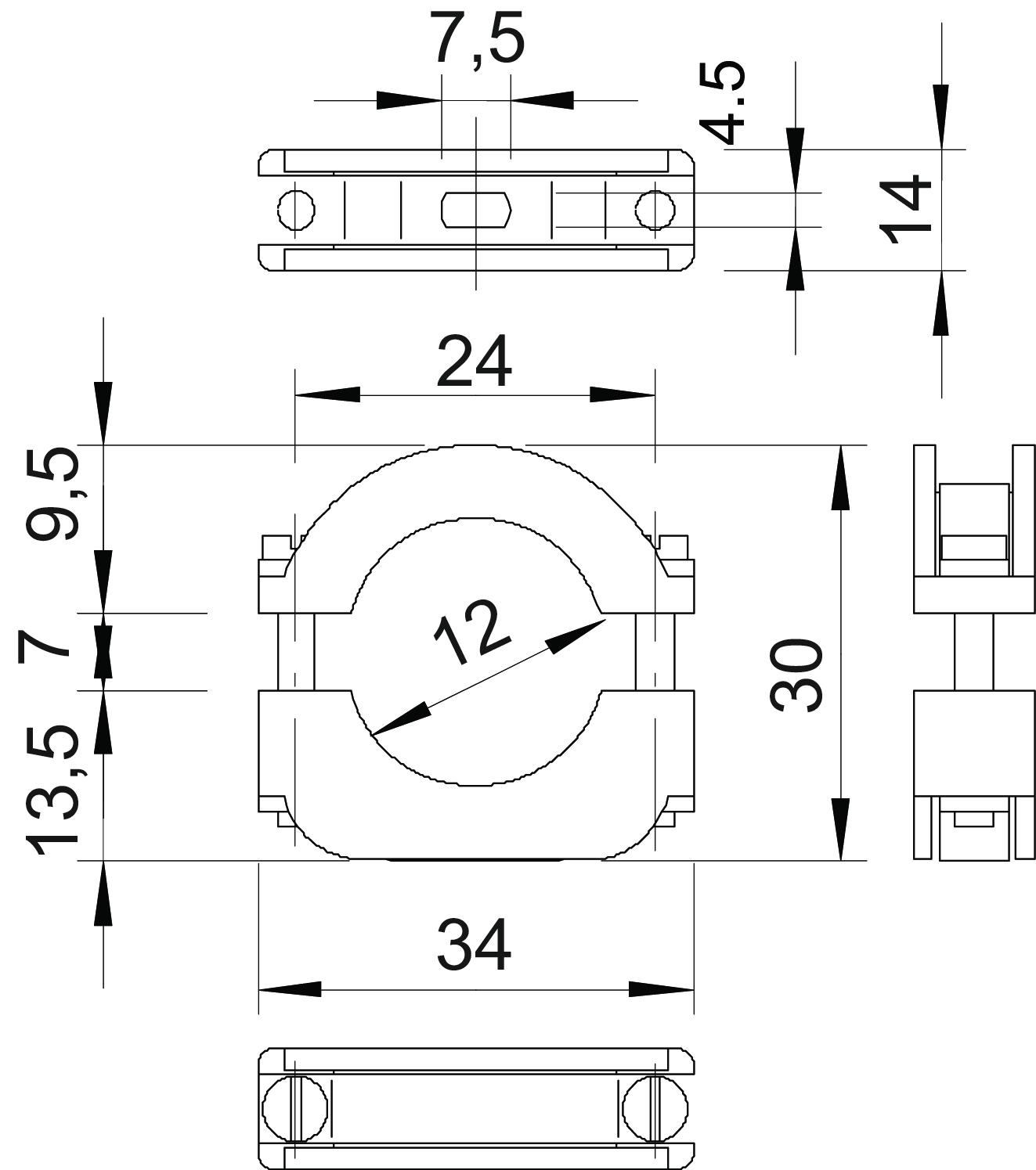 Avec gaine en matière plastique non Convient pour les espaces coupe-feu non Cote A 34 mm Cote B 24 mm Cote b 14 mm Cote D 12 mm Cote L 7,5 mm Cote x 7 mm Couleur gris clair; RAL 7035 Dimension 6-12mm Dimension H 30 mm Dimension Ho (mm) 9,5 Dimension Hu (mm) 13,5 Empreinte CO2 (GWP) du berceau à la porte 0,0498 kg CO2e / 1 Pièce Matériau Polystyrène Modèle fermé Nombre de câbles/tubes 1 Plage de serrage D max. 12 mm Plage de serrage D min. 6 mm Résistant aux UV non Sans halogène oui Type de fixation Trou de vis Vis M4 x 22 - Tous les types
