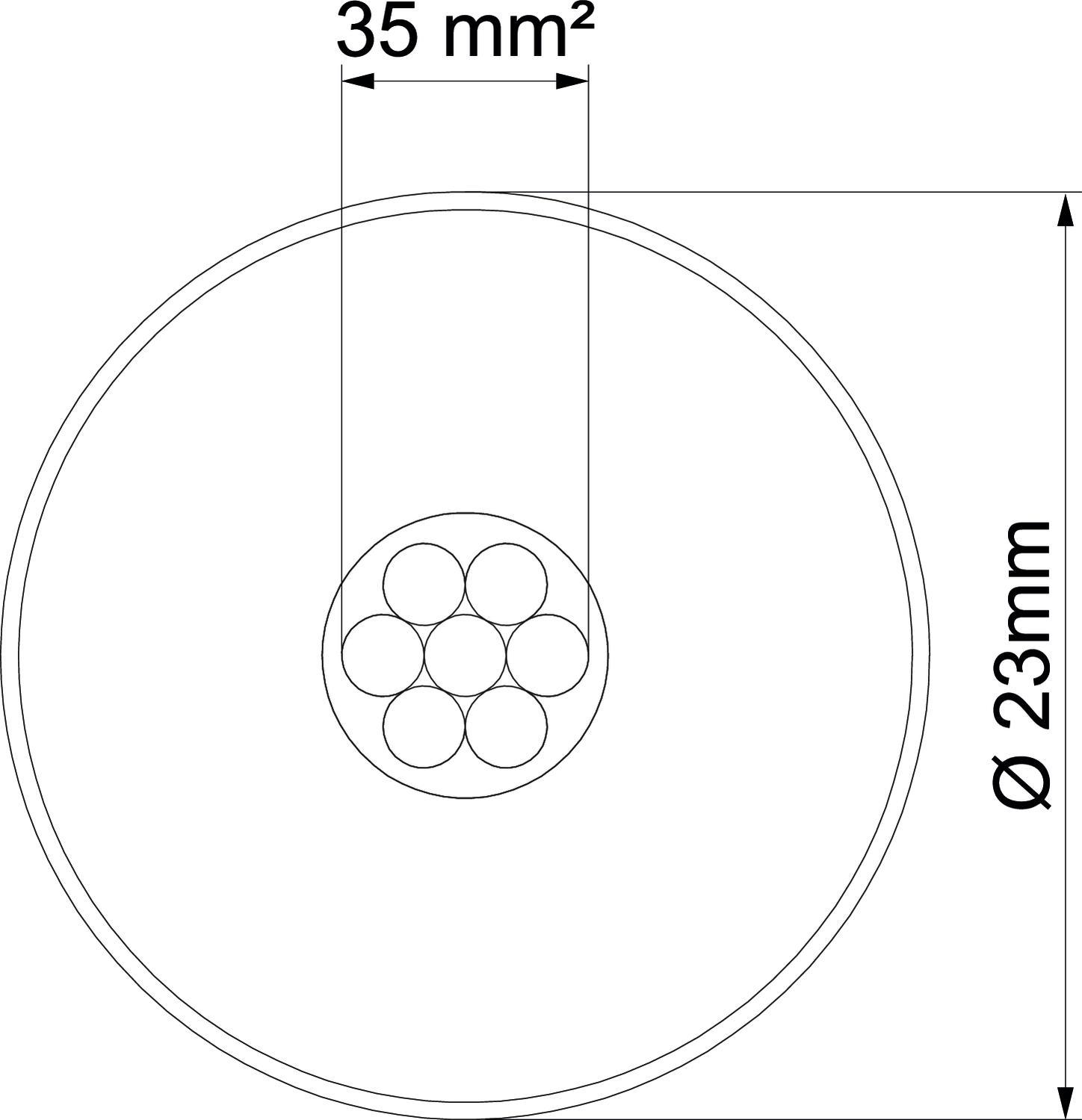 Bague normale (env. m) 100 Couleur noir Diamètre 23 mm Dimension Ø23mm Distance de séparation équivalente s(e)/m 0,9 Enveloppe du matériau EVA Length tolerance ± 5 % Modèle isolé haute tension oui Nombre de fils individuels 7 Propriété du matériau autres Section 35 mm² - Tous les types