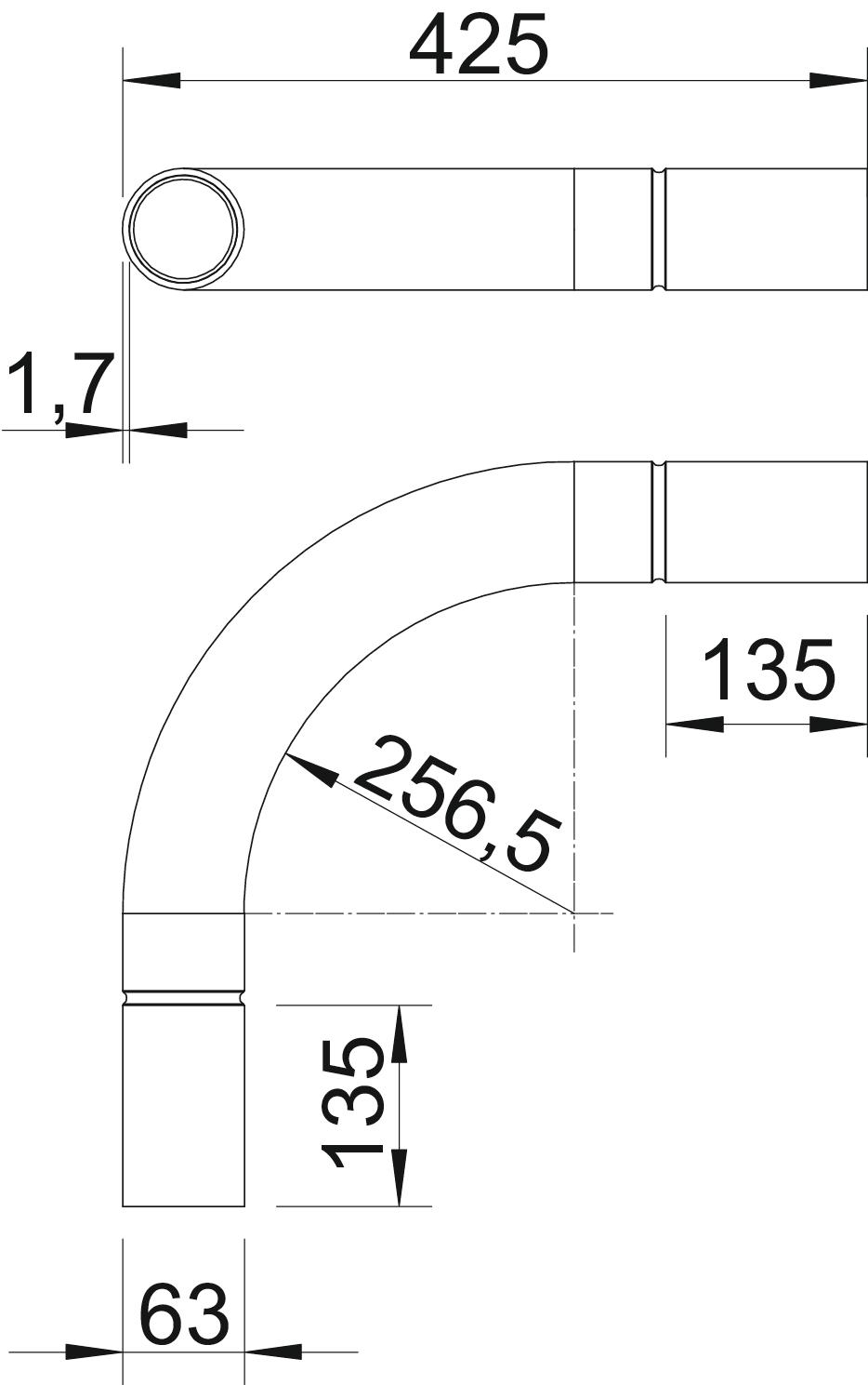 Angle de coude 90 ° Avec manchon oui Avec ouverture d'inspection et couvercle non Cote A 135 mm Cote B 425 mm Cote D 63 mm Cote l 70 mm Cote R 225 mm Cote t 1,7 mm Dimension Ø63mm Dimension m (mm) M63 En deux parties non Flexible non Matériau Aluminium Modèle Emboîtement Plage de températures d’utilisation max. 250 °C Plage de températures d’utilisation min. -45 °C pour diamètre de tube nominal 63 mm Sans halogène non Surface brossée non Surface polie non - Tous les types