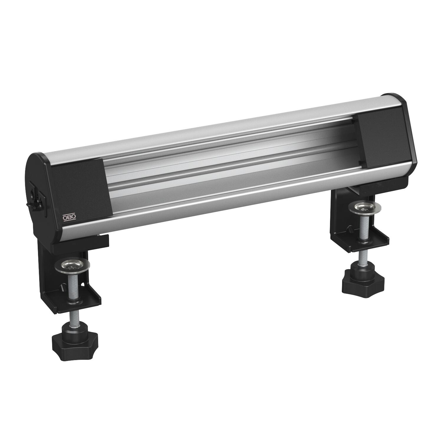 Boîtier prêt à raccorder Deskbox DBL pour l’alimentation directe des postes de travail avec raccordements électrique. Avec un connecteur GST18® Wieland depuis la gauche du profilé. Montage sans outils avec deux étriers de fixation pour plateaux de bureau d’une épaisseur de 8 à 40 mm avec étrier de fixation standard et d’une épaisseur de 40 à 70 mm avec étrier de fixation DBZ-BZL70. Le boîtier Deskbox n’est pas équipé et peut être équipé de jusqu’à 5 appareillages de type Modul 45®.