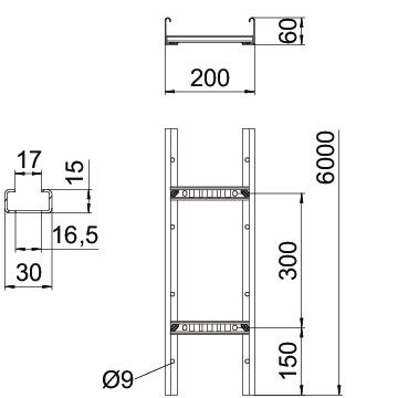 Description du produitÉchelle à câbles d'une hauteur latérale de 60 mm avec échelons soudés à profilé C30 ouvert vers le haut. Longeron latéral enroulé pour le renforcement et la protection des bords. La fixation sur console s'effectue avec des pièces de serrage de type LKS 40. La fente de l'échelon mesure 16,5 mm. La bride de fixation correspondante est de type 2056.