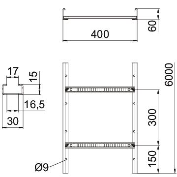 Description du produitÉchelle à câbles d'une hauteur latérale de 60 mm avec échelons soudés à profilé C30 ouvert vers le haut. Longeron latéral enroulé pour le renforcement et la protection des bords. La fixation sur console s'effectue avec des pièces de serrage de type LKS 40. La fente de l'échelon mesure 16,5 mm. La bride de fixation correspondante est de type 2056.